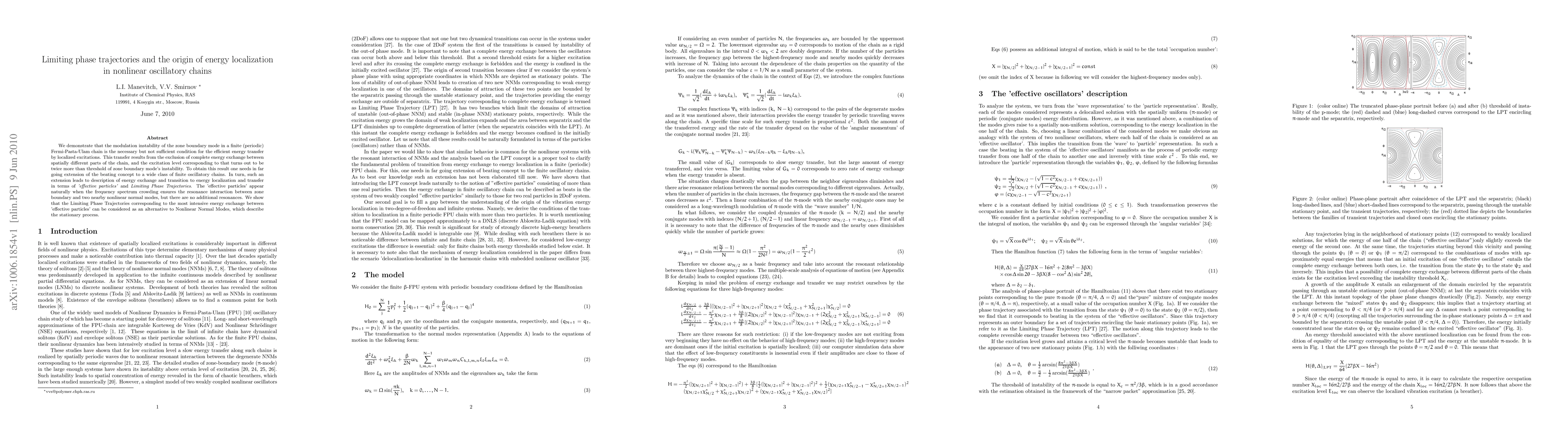 We demonstrate that the modulation instability of the zone boundary mode in a finite (periodic) Fermi-Pasta-Ulam chain is the necessary but not sufficient condition for the efficient energy transfer by localized excitations. This transfer results from the exclusion of complete energy exchange between spatially different parts of the chain, and the excitation level corresponding to that turns out to be twice more than threshold of zone boundary mode's instability. To obtain this result one needs in far going extension of the beating concept to a wide class of finite oscillatory chains. In turn, such an extension leads to description of energy exchange and transition to energy localization and transfer in terms of 'effective particles' and Limiting Phase Trajectories. The 'effective particles' appear naturally when the frequency spectrum crowding ensures the resonance interaction between zone boundary and two nearby nonlinear normal modes, but there are no additional resonances. We show that the Limiting Phase Trajectories corresponding to the most intensive energy exchange between 'effective particles' can be considered as an alternative to Nonlinear Normal Modes, which describe the stationary process.