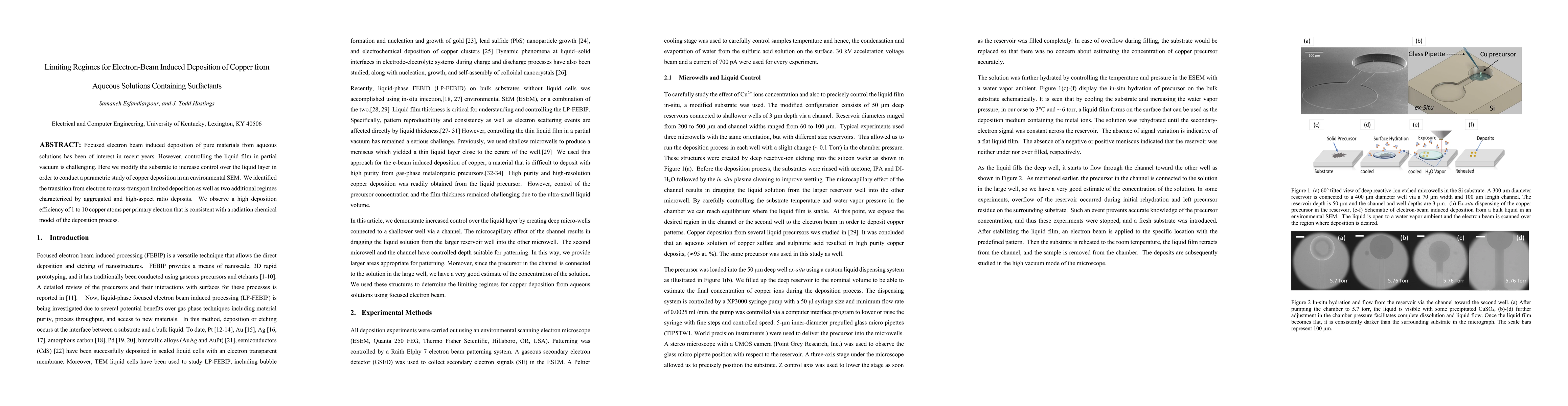 Focused electron beam induced deposition of pure materials from aqueous solutions has been of interest in recent years. However, controlling the liquid film in partial vacuum is challenging. Here we modify the substrate to increase control over the liquid layer in order to conduct a parametric study of copper deposition in an environmental SEM. We identified the transition from electron to mass-transport limited deposition as well as two additional regimes characterized by aggregated and high-aspect ratio deposits. We observe a high deposition efficiency of 1 to 10 copper atoms per primary electron that is consistent with a radiation chemical model of the deposition process.