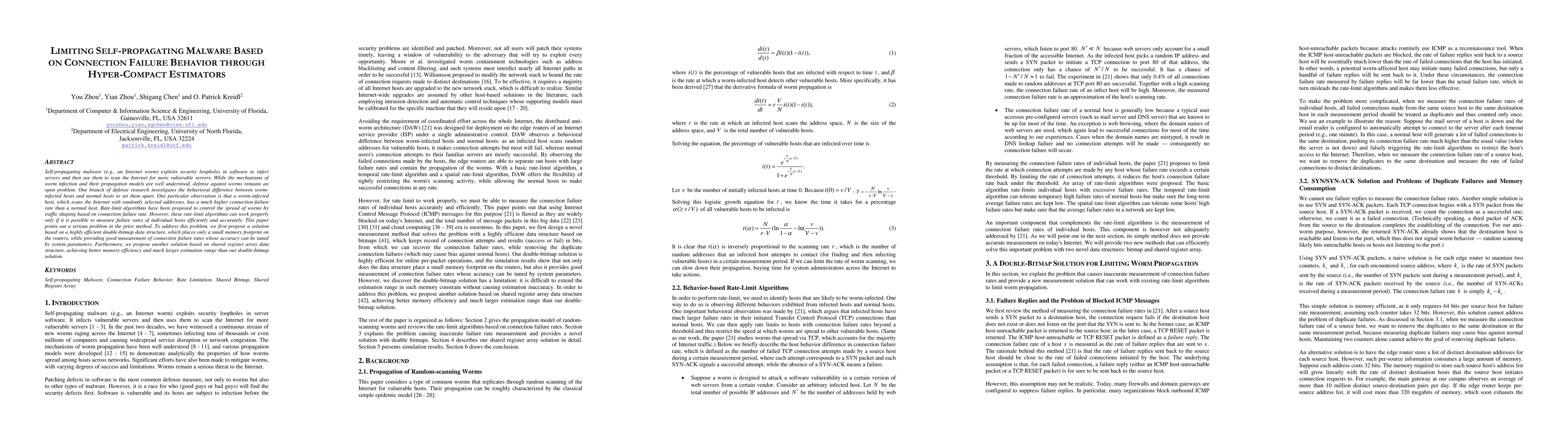 This paper proposes new hyper-compact estimators to accurately measure connection failure rates, which can help limit the spread of self-propagating malware by identifying and controlling high-failure-rate hosts. The proposed solutions utilize double-bitmap and shared register array data structures to achieve efficient memory usage and accurate rate-limiting.