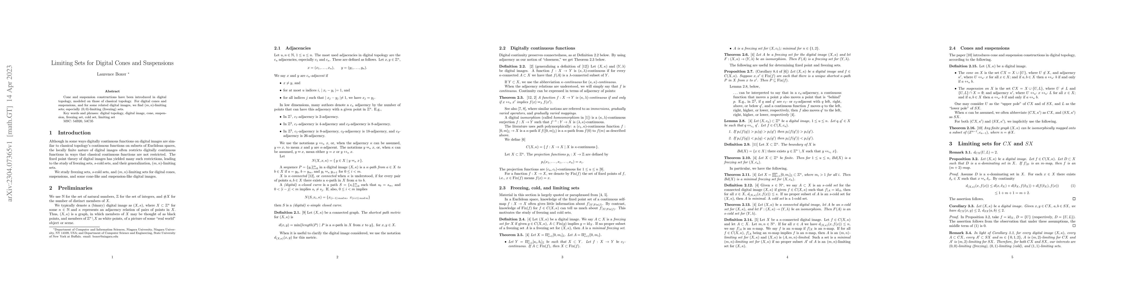 This paper investigates (m, n)-limiting sets, particularly (0, 0)-limiting sets, for digital cones and suspensions in the context of digital topology, aiming to understand their structural properties and implications.