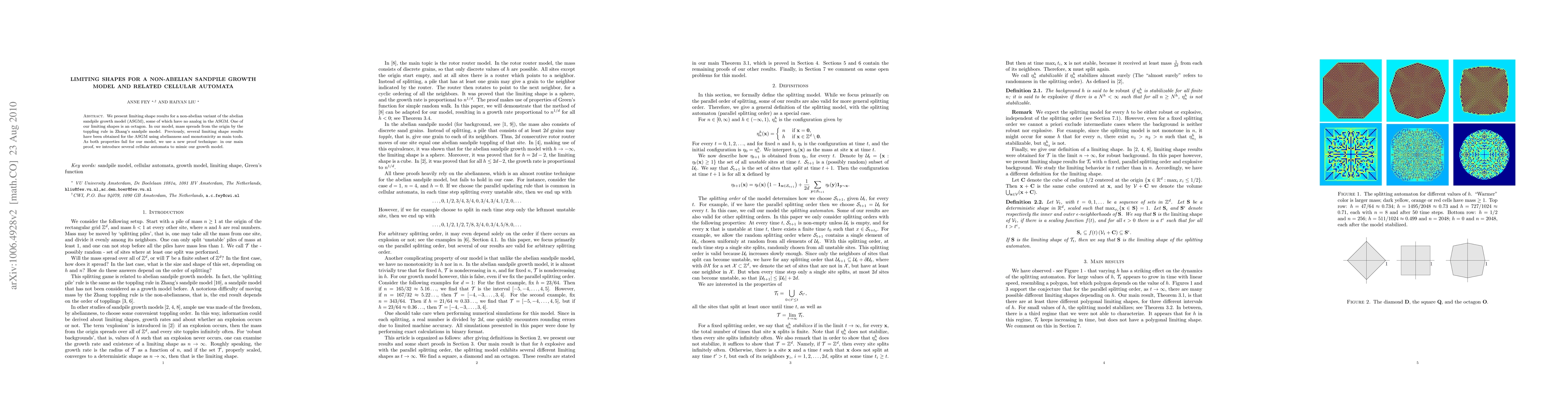 This paper presents limiting shape results for a non-abelian sandpile growth model, including an octagon shape, which contrasts with the abelian sandpile model. The authors employ cellular automata to analyze the model, as traditional methods fail due to the absence of abelianness and monotonicity.
