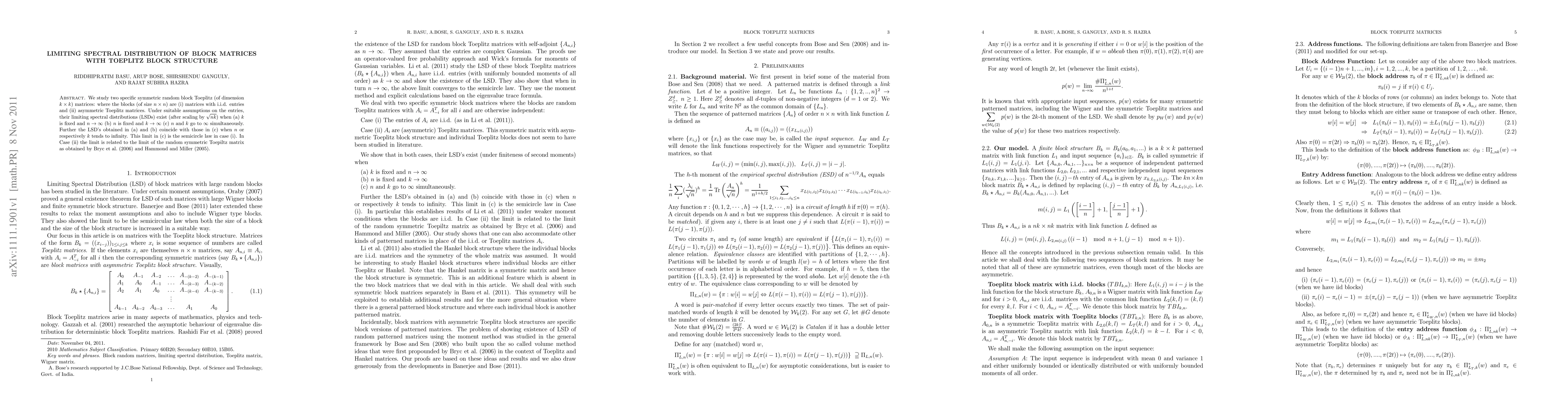 We study two specific symmetric random block Toeplitz (of dimension $k \times k$) matrices: where the blocks (of size $n \times n$) are (i) matrices with i.i.d. entries, and (ii) asymmetric Toeplitz matrices. Under suitable assumptions on the entries, their limiting spectral distributions (LSDs) exist (after scaling by $\sqrt{nk}$) when (a) $k$ is fixed and $n \to\infty$ (b) $n$ is fixed and $k\rightarrow \infty$ (c) $n$ and $k$ go to $\infty$ simultaneously. Further the LSD's obtained in (a) and (b) coincide with those in (c) when $n$ or respectively $k$ tends to infinity. This limit in (c) is the semicircle law in case (i). In Case (ii) the limit is related to the limit of the random symmetric Toepiltz matrix as obtained by Bryc et al.(2006) and Hammond and Miller(2005).