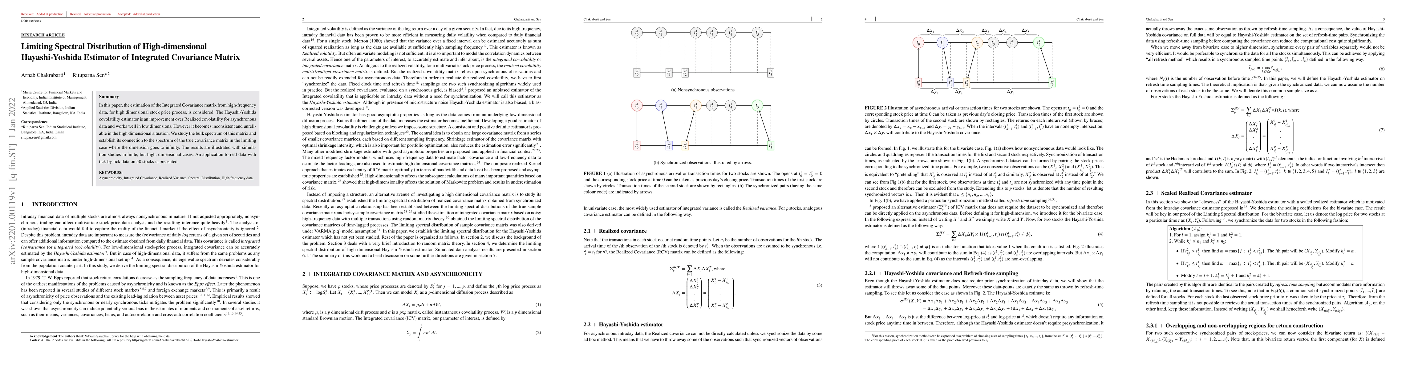 This paper investigates the Hayashi-Yoshida estimator for high-dimensional integrated covariance matrices from high-frequency data, revealing its inconsistency in high dimensions. It establishes the limiting spectral distribution and demonstrates its connection to the true covariance matrix spectrum, supported by simulations and an application to tick-by-tick data on 50 stocks.