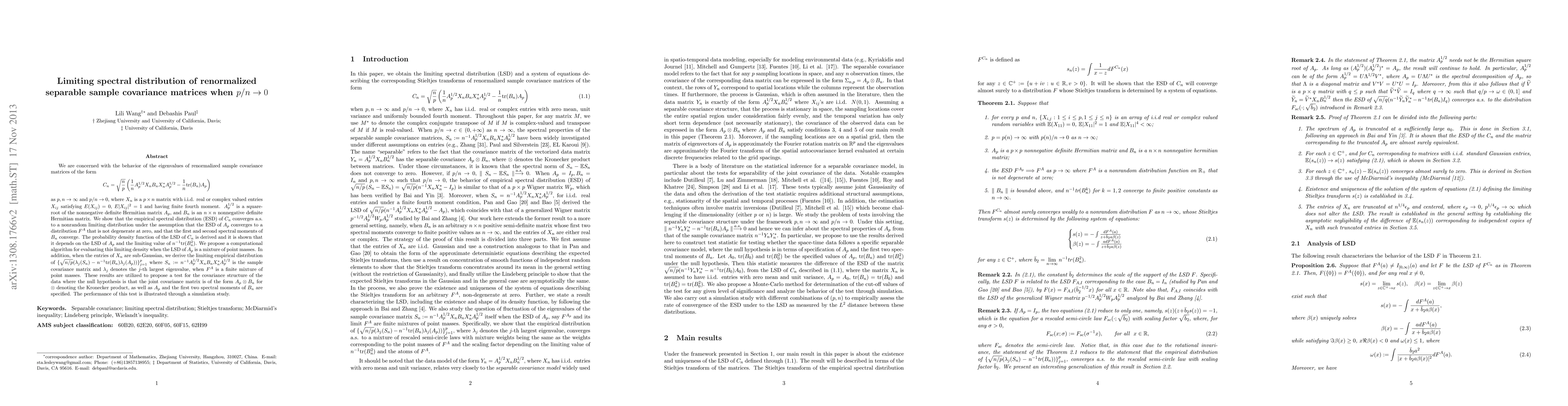 We are concerned with the behavior of the eigenvalues of renormalized sample covariance matrices of the form C_n=\sqrt{\frac{n}{p}}\left(\frac{1}{n}A_{p}^{1/2}X_{n}B_{n}X_{n}^{*}A_{p}^{1/2}-\frac{1}{n}\tr(B_{n})A_{p}\right) as $p,n\to \infty$ and $p/n\to 0$, where $X_{n}$ is a $p\times n$ matrix with i.i.d. real or complex valued entries $X_{ij}$ satisfying $E(X_{ij})=0$, $E|X_{ij}|^2=1$ and having finite fourth moment. $A_{p}^{1/2}$ is a square-root of the nonnegative definite Hermitian matrix $A_{p}$, and $B_{n}$ is an $n\times n$ nonnegative definite Hermitian matrix. We show that the empirical spectral distribution (ESD) of $C_n$ converges a.s. to a nonrandom limiting distribution under some assumptions. The probability density function of the LSD of $C_{n}$ is derived and it is shown that it depends on the LSD of $A_{p}$ and the limiting value of $n^{-1}\tr(B_{n}^2)$. We propose a computational algorithm for evaluating this limiting density when the LSD of $A_{p}$ is a mixture of point masses. In addition, when the entries of $X_{n}$ are sub-Gaussian, we derive the limiting empirical distribution of $\{\sqrt{n/p}(\lambda_j(S_n) - n^{-1}\tr(B_n) \lambda_j(A_{p}))\}_{j=1}^p$ where $S_n := n^{-1} A_{p}^{1/2}X_{n}B_{n}X_{n}^{*}A_{p}^{1/2}$ is the sample covariance matrix and $\lambda_j$ denotes the $j$-th largest eigenvalue, when $F^A$ is a finite mixture of point masses. These results are utilized to propose a test for the covariance structure of the data where the null hypothesis is that the joint covariance matrix is of the form $A_{p} \otimes B_n$ for $\otimes$ denoting the Kronecker product, as well as $A_{p}$ and the first two spectral moments of $B_n$ are specified. The performance of this test is illustrated through a simulation study.