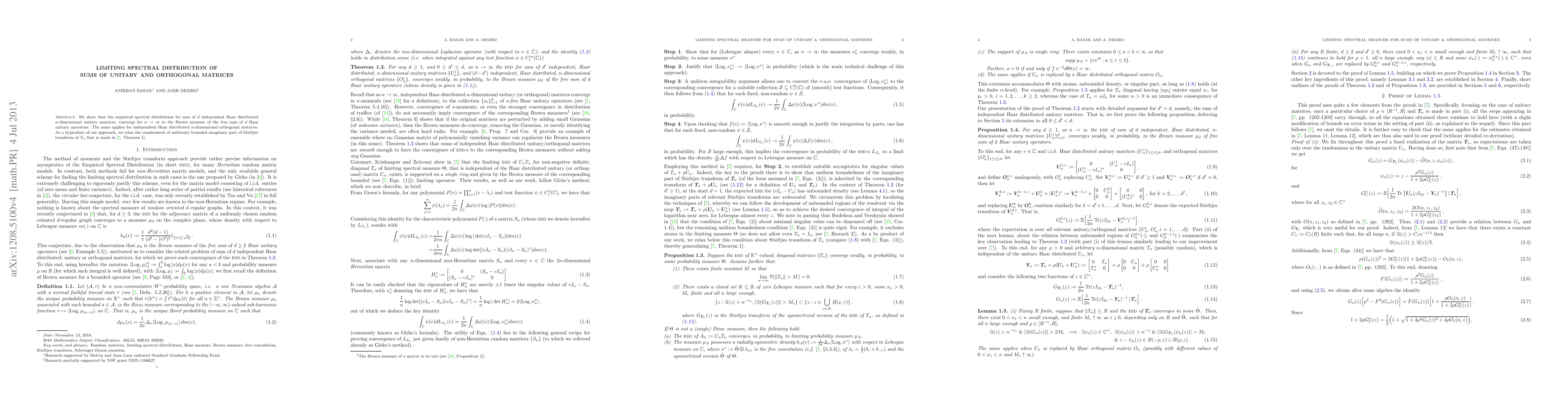 We show that the empirical eigenvalue measure for sum of $d$ independent Haar distributed $n$-dimensional unitary matrices, converge for $n \to \infty$ to the Brown measure of the free sum of $d$ Haar unitary operators. The same applies for independent Haar distributed $n$-dimensional orthogonal matrices. As a byproduct of our approach, we relax the requirement of uniformly bounded imaginary part of Stieltjes transform of $T_n$ that is made in [Guionnet, Krishnapur, Zeitouni; Theorem 1].