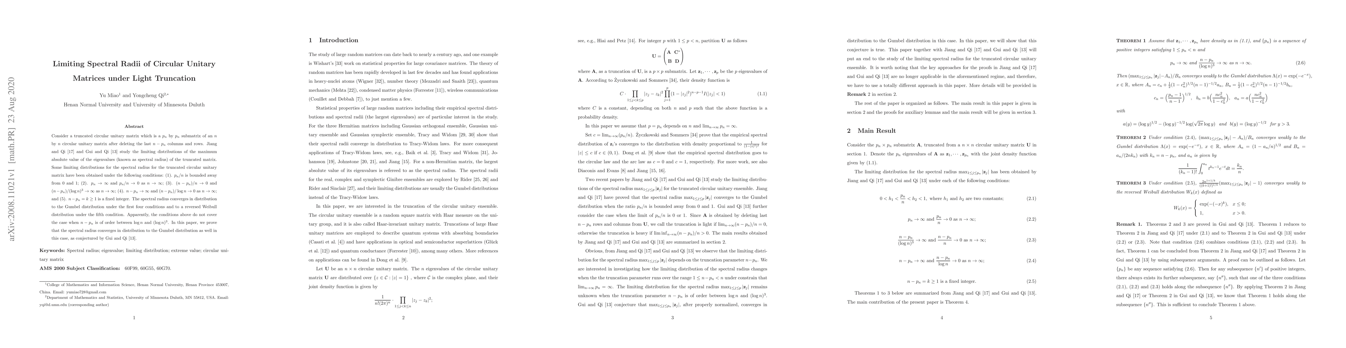 Consider a truncated circular unitary matrix which is a $p_n$ by $p_n$ submatrix of an $n$ by $n$ circular unitary matrix after deleting the last $n-p_n$ columns and rows. Jiang and Qi \cite{JiangQi2017} and Gui and Qi \cite{GQ2018} study the limiting distributions of the maximum absolute value of the eigenvalues (known as spectral radius) of the truncated matrix. Some limiting distributions for the spectral radius for the truncated circular unitary matrix have been obtained under the following conditions: (1). $p_n/n$ is bounded away from $0$ and $1$; (2). $p_n\to\infty$ and $p_n/n\to 0$ as $n\to\infty$; (3). $(n-p_n)/n\to 0$ and $(n-p_n)/(\log n)^3\to\infty$ as $n\to\infty$; (4). $n-p_n\to\infty$ and $(n-p_n)/\log n\to 0$ as $n\to\infty$; and (5). $n-p_n=k\ge 1$ is a fixed integer. The spectral radius converges in distribution to the Gumbel distribution under the first four conditions and to a reversed Weibull distribution under the fifth condition. Apparently, the conditions above do not cover the case when $n-p_n$ is of order between $\log n$ and $(\log n)^3$. In this paper, we prove that the spectral radius converges in distribution to the Gumbel distribution as well in this case, as conjectured by Gui and Qi \cite{GQ2018}.