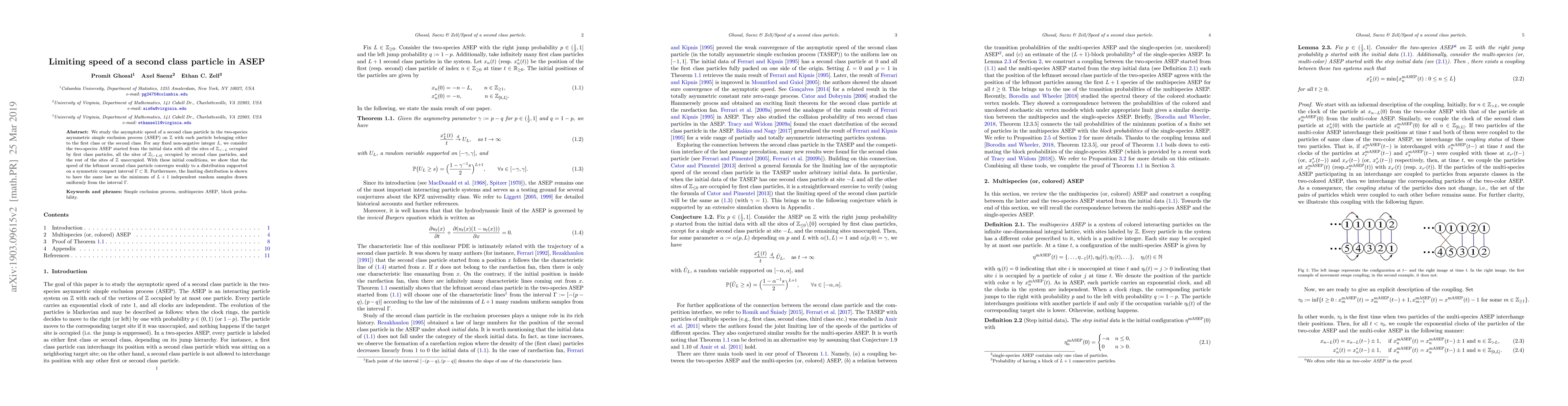 This paper investigates the asymptotic speed of a second class particle in the asymmetric simple exclusion process (ASEP) with two particle classes. It shows that the speed of the leftmost second class particle converges to a distribution supported on a symmetric interval, which is equivalent to the minimum of $L+1$ independent uniform samples from this interval.