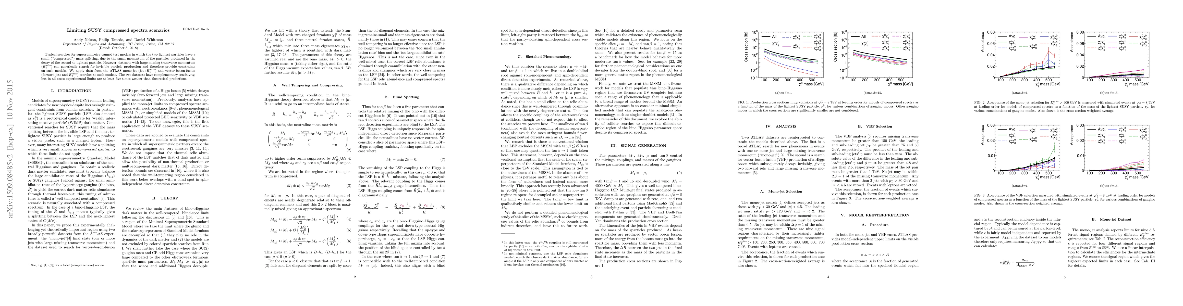Typical searches for supersymmetry cannot test models in which the two lightest particles have a small ("compressed") mass splitting, due to the small momentum of the particles produced in the decay of the second-to-lightest particle. However, datasets with large missing transverse momentum ($E_{\rm T}^{\rm miss}$) can generically search for invisible particle production and therefore provide constraints on such models. We apply data from the ATLAS mono-jet (jet+$E_{\rm T}^{\rm miss}$) and vector-boson-fusion (forward jets and $E_{\rm T}^{\rm miss}$) searches to such models. The two datasets have complementary sensitivity, but in all cases experimental limits are at least five times weaker than theoretical predictions.