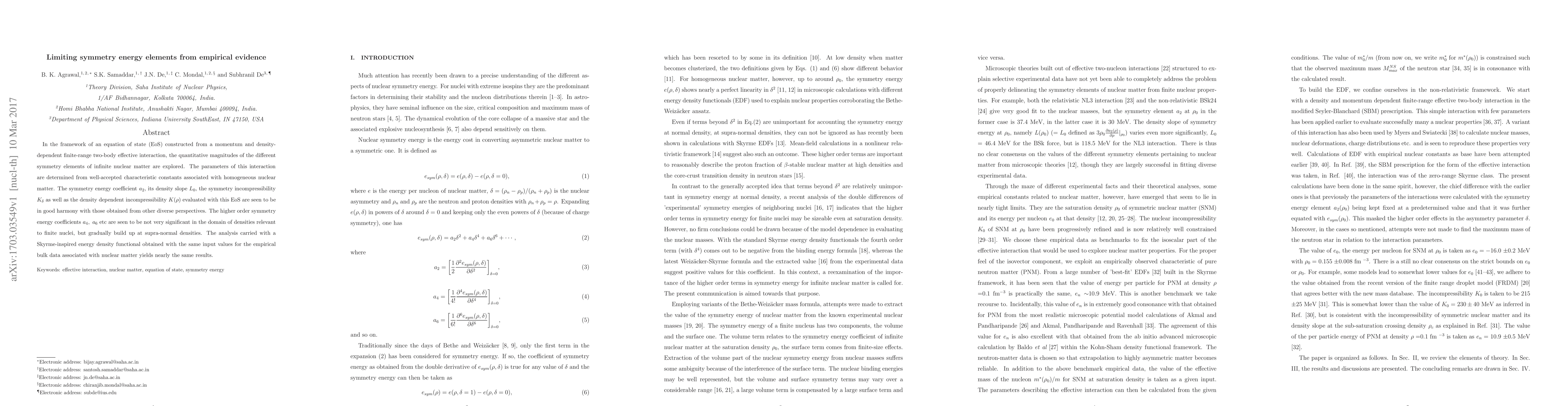 In the framework of an equation of state (EoS) constructed from a momentum and density-dependent finite-range two-body effective interaction, the quantitative magnitudes of the different symmetry elements of infinite nuclear matter are explored. The parameters of this interaction are determined from well-accepted characteristic constants associated with homogeneous nuclear matter. The symmetry energy coefficient $a_2$, its density slope $L_0$, the symmetry incompressibility $K_\delta $ as well as the density dependent incompressibility $K(\rho )$ evaluated with this EoS are seen to be in good harmony with those obtained from other diverse perspectives. The higher order symmetry energy coefficients $a_4,~a_6$ etc are seen to be not very significant in the domain of densities relevant to finite nuclei, but gradually build up at supra-normal densities. The analysis carried with a Skyrme-inspired energy density functional obtained with the same input values for the empirical bulk data associated with nuclear matter yields nearly the same results.