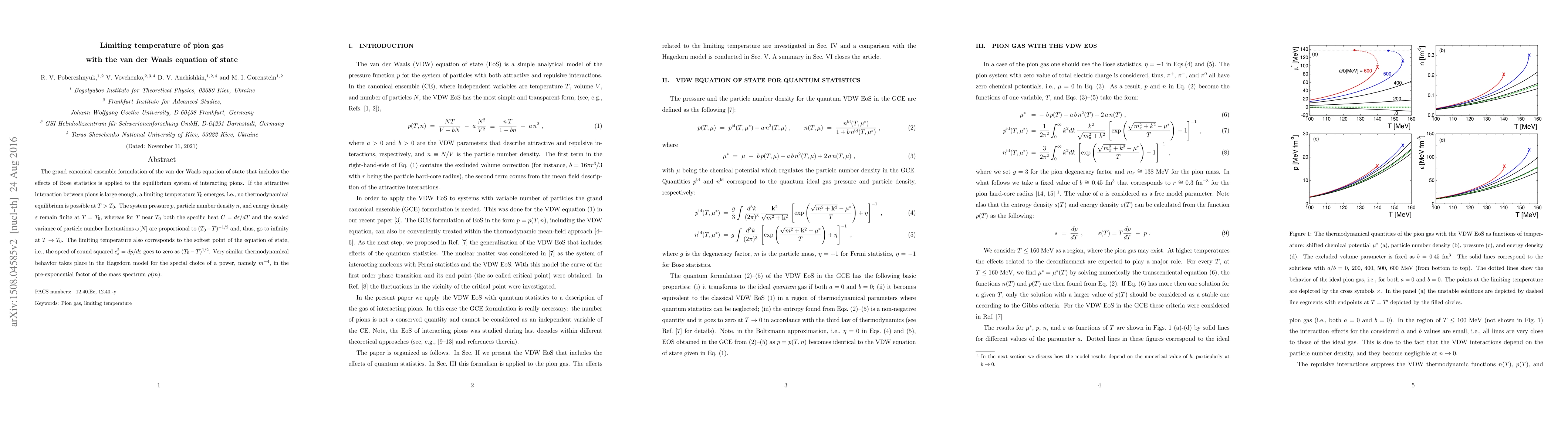 The grand canonical ensemble formulation of the van der Waals equation of state that includes the effects of Bose statistics is applied to an equilibrium system of interacting pions. If the attractive interaction between pions is large enough, a limiting temperature $T_0$ emerges, i.e., no thermodynamical equilibrium is possible at $T>T_0$. The system pressure $p$, particle number density $n$, and energy density $\varepsilon$ remain finite at $T=T_0$, whereas for $T$ near $T_0$ both the specific heat $C=d\varepsilon/dT$ and the scaled variance of particle number fluctuations $\omega[N]$ are proportional to $(T_0-T)^{-1/2}$ and, thus, go to infinity at $T\rightarrow T_0$. The limiting temperature corresponds also to the softest point of the equation of state, i.e., the speed of sound squared $c_s^2=dp/d\varepsilon$ goes to zero as $(T_0-T)^{1/2}$. Very similar thermodynamical behavior takes place in the Hagedorn model for the special choice of a power, namely $m^{-4}$, in the pre-exponential factor of the mass spectrum $\rho(m)$.