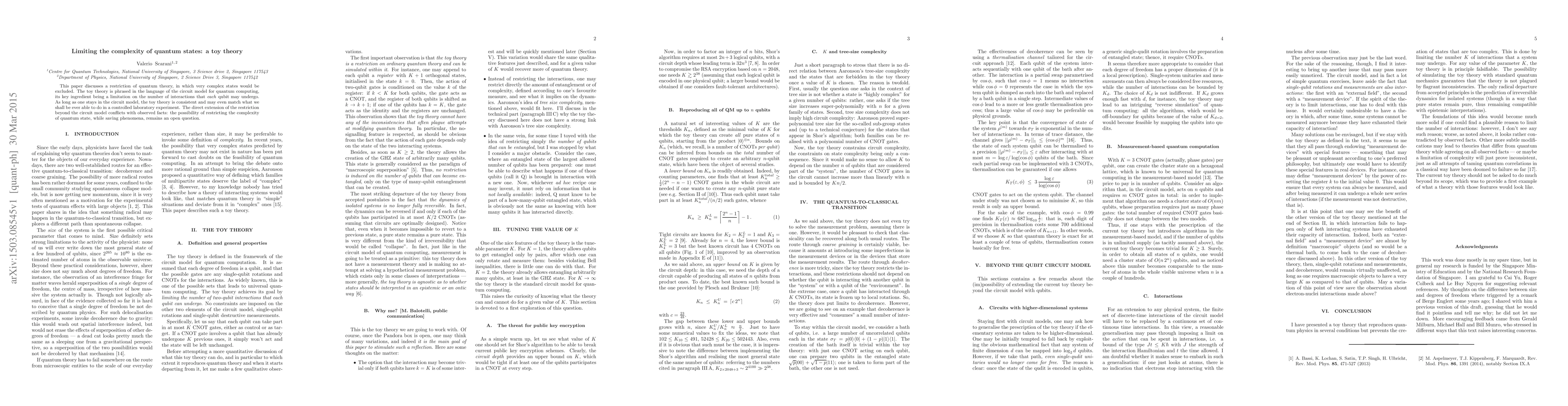 This paper discusses a restriction of quantum theory, in which very complex states would be excluded. The toy theory is phrased in the language of the circuit model for quantum computing, its key ingredient being a limitation on the number of interactions that \textit{each} qubit may undergo. As long as one stays in the circuit model, the toy theory is consistent and may even match what we shall be ever able to do in a controlled laboratory experiment. The direct extension of the restriction beyond the circuit model conflicts with observed facts: the possibility of restricting the complexity of quantum state, while saving phenomena, remains an open question.