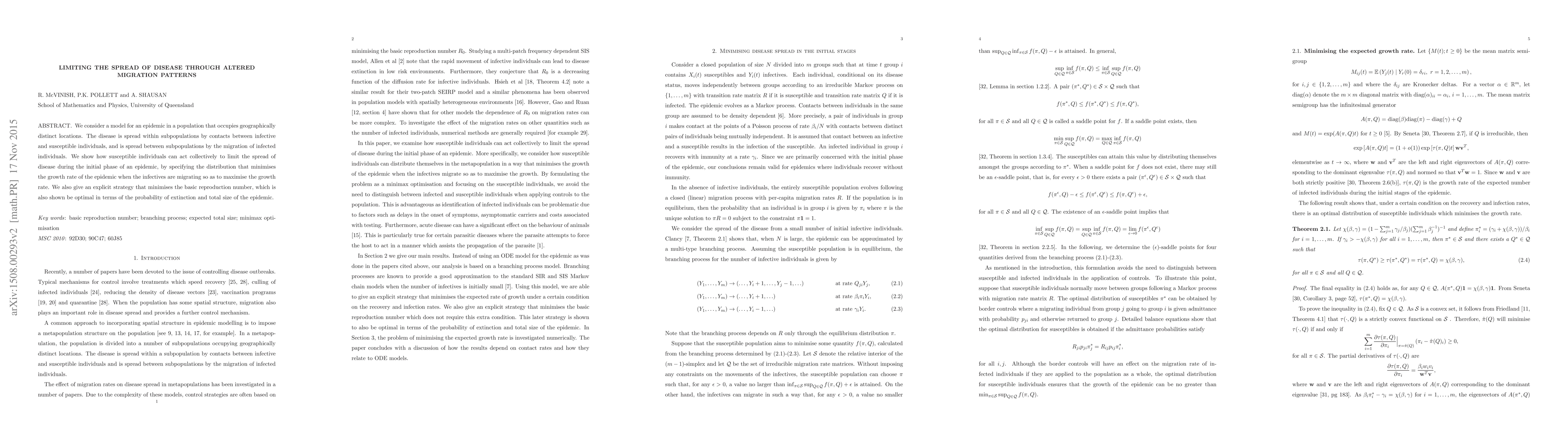 We consider a model for an epidemic in a population that occupies geographically distinct locations. The disease is spread within subpopulations by contacts between infective and susceptible individuals, and is spread between subpopulations by the migration of infected individuals. We show how susceptible individuals can act collectively to limit the spread of disease during the initial phase of an epidemic, by specifying the distribution that minimises the growth rate of the epidemic when the infectives are migrating so as to maximise the growth rate. We also give an explicit strategy that minimises the basic reproduction number, which is also shown be optimal in terms of the probability of extinction and total size of the epidemic.