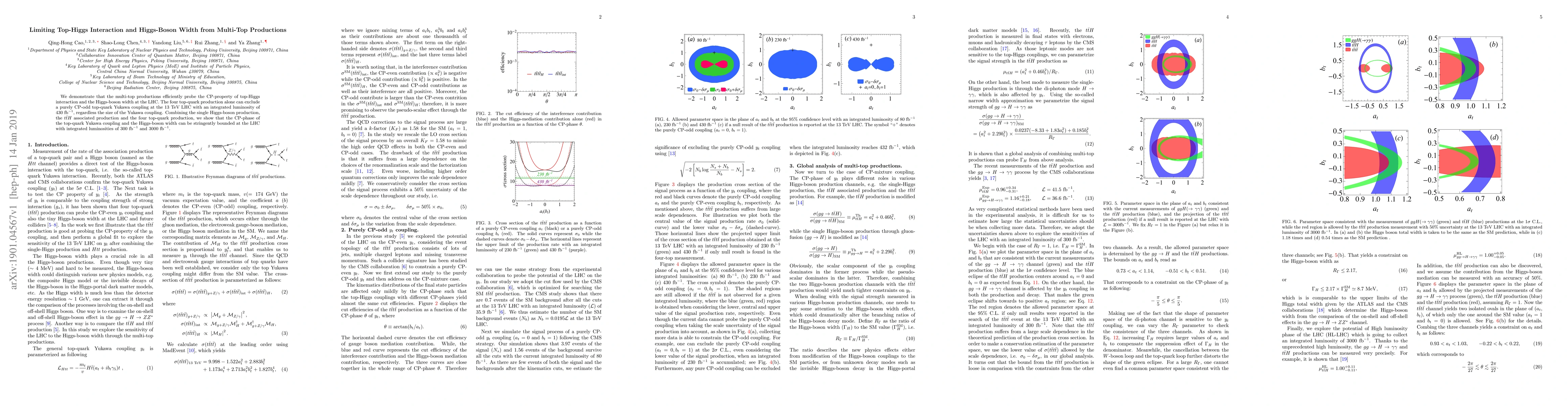 We demonstrate that the multi-top productions efficiently probe the CP-property of top-Higgs interaction and the Higgs-boson width at the LHC. The four top-quark production alone can exclude a purely CP-odd top-quark Yukawa coupling at the 13~TeV LHC with an integrated luminosity of $430~{\rm fb}^{-1}$, regardless the size of the Yukawa coupling. Combining the single Higgs-boson production, the $t\bar{t}H$ associated production and the four top-quark production, we show that the CP-phase of the top-quark Yukawa coupling and the Higgs-boson width can be stringently bounded at the LHC with integrated luminosities of $300~{\rm fb}^{-1}$ and $3000~{\rm fb}^{-1}$.