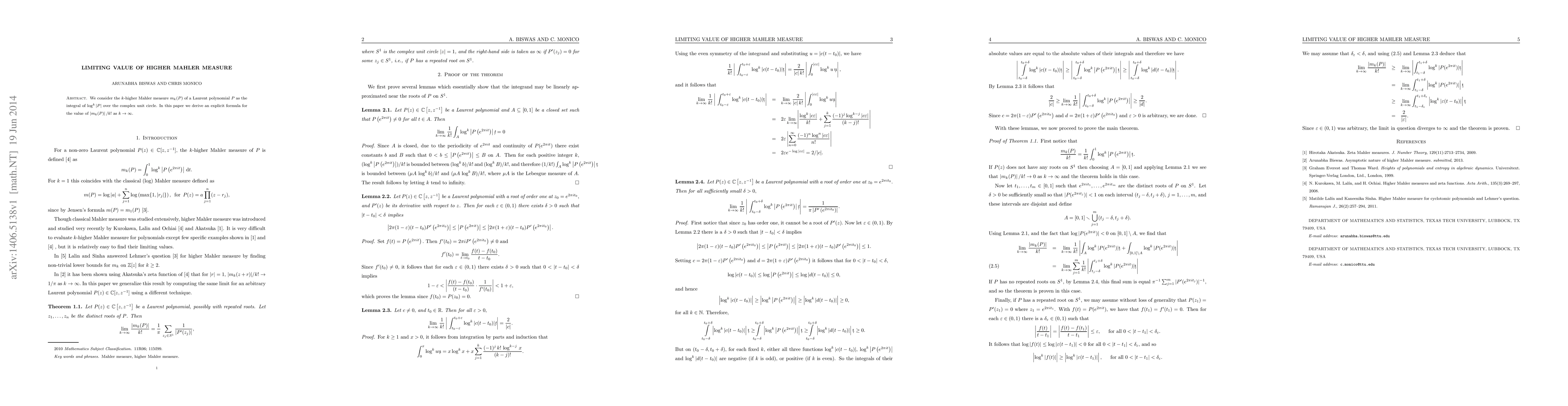 We consider the $k$-higher Mahler measure $m_k(P)$ of a Laurent polynomial $P$ as the integral of $\log ^k \left| P \right|$ over the complex unit circle. In this paper we derive an explicit formula for the value of $\left| m_k(P) \right|/k!$ as $k \to \infty.$