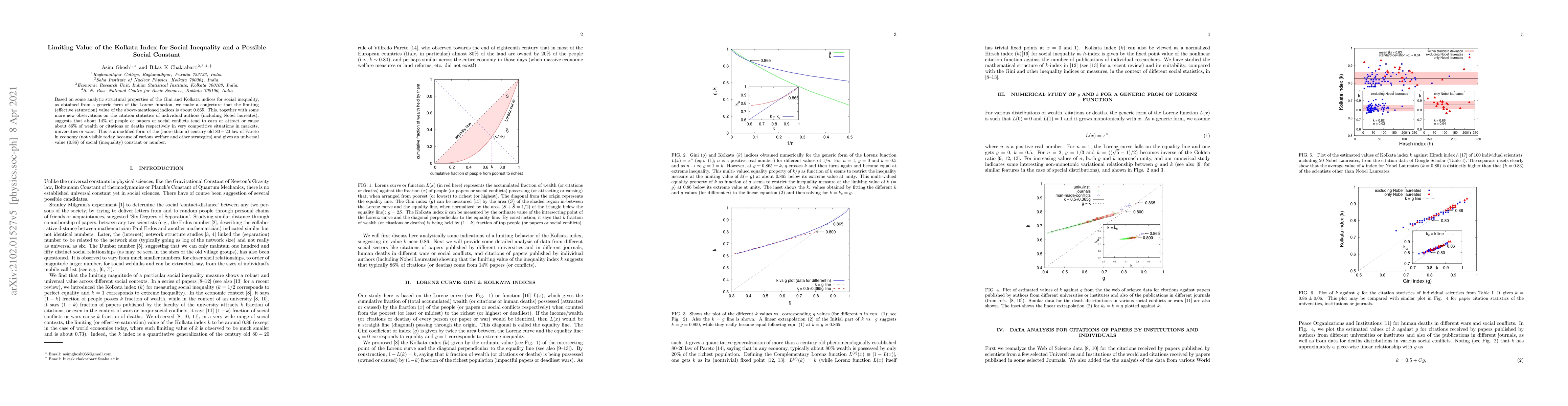 Based on some analytic structural properties of the Gini and Kolkata indices for social inequality, as obtained from a generic form of the Lorenz function, we make a conjecture that the limiting (effective saturation) value of the above-mentioned indices is about 0.865. This, together with some more new observations on the citation statistics of individual authors (including Nobel laureates), suggests that about $14\%$ of people or papers or social conflicts tend to earn or attract or cause about $86\%$ of wealth or citations or deaths respectively in very competitive situations in markets, universities or wars. This is a modified form of the (more than a) century old $80-20$ law of Pareto in economy (not visible today because of various welfare and other strategies) and gives an universal value ($0.86$) of social (inequality) constant or number.