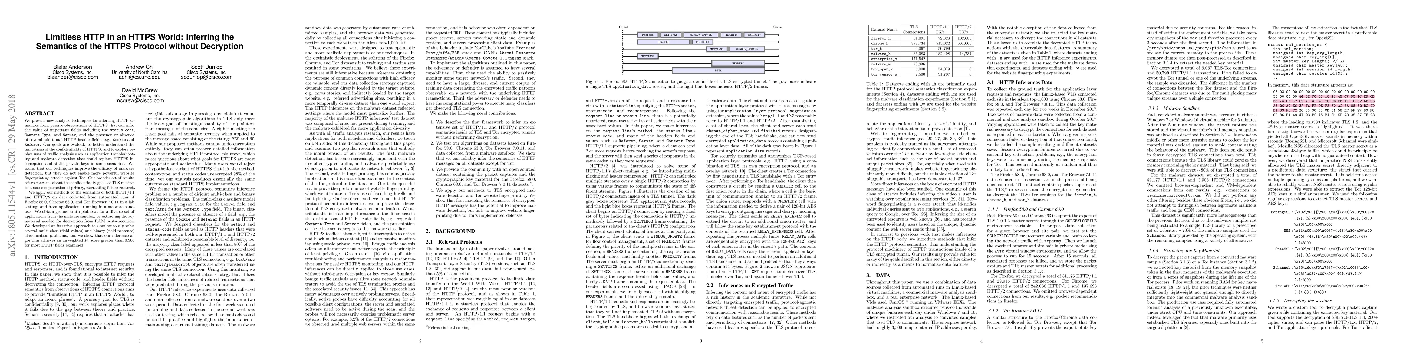 We present new analytic techniques for inferring HTTP semantics from passive observations of HTTPS that can infer the value of important fields including the status-code, Content-Type, and Server, and the presence or absence of several additional HTTP header fields, e.g., Cookie and Referer. Our goals are twofold: to better understand the limitations of the confidentiality of HTTPS, and to explore benign uses of traffic analysis such as application troubleshooting and malware detection that could replace HTTPS interception and static private keys in some scenarios. We found that our techniques improve the efficacy of malware detection, but they do not enable more powerful website fingerprinting attacks against Tor. Our broader set of results raises concerns about the confidentiality goals of TLS relative to a user's expectation of privacy, warranting future research. We apply our methods to the semantics of both HTTP/1.1 and HTTP/2 on data collected from automated runs of Firefox 58.0, Chrome 63.0, and Tor Browser 7.0.11 in a lab setting, and from applications running in a malware sandbox. We obtain ground truth plaintext for a diverse set of applications from the malware sandbox by extracting the key material needed for decryption from RAM post-execution. We developed an iterative approach to simultaneously solve several multi-class (field values) and binary (field presence) classification problems, and we show that our inference algorithm achieves an unweighted $F_1$ score greater than 0.900 for most HTTP fields examined.