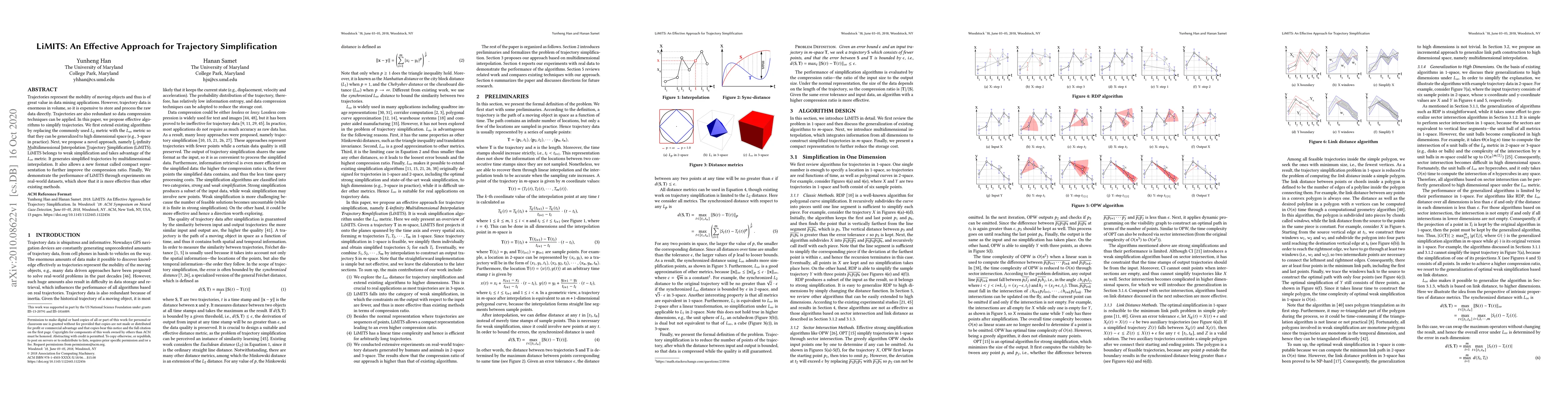 This paper proposes LiMITS, an effective trajectory simplification approach using the $L_\infty$ metric for high-dimensional data. It introduces a novel method for multidimensional interpolation to generate simplified trajectories and a compact representation to enhance compression ratios, outperforming existing methods in experiments.