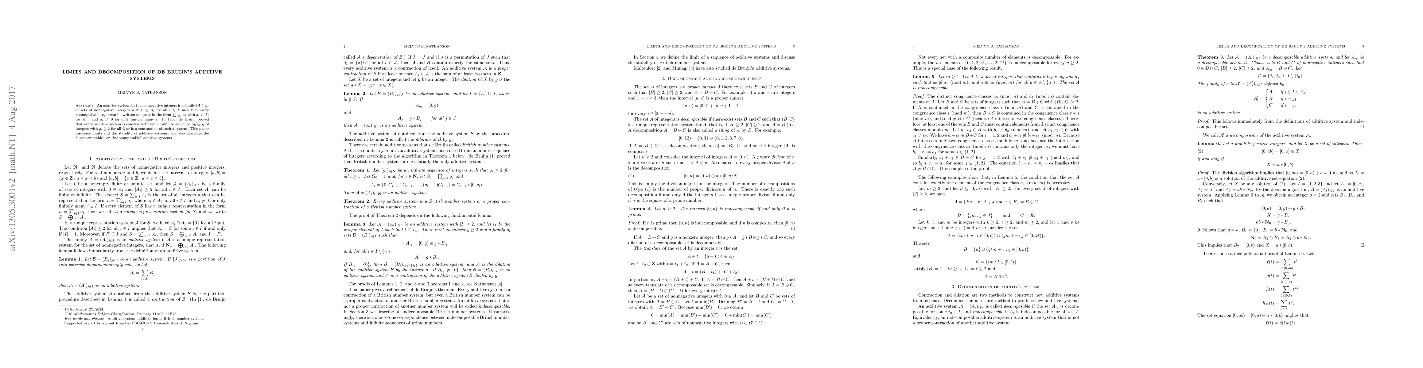 An additive system for the nonnegative integers is a family (A_i)_{i\in I} of sets of nonnegative integers with 0 \in A_i for all i \in I such that every nonnegative integer can be written uniquely in the form \sum_{i\in I} a_i with a_i \in A_i for all i and a_i \neq 0 for only finitely many i. In 1956, de Bruijn proved that every additive system is constructed from an infinite sequence (g_i)_{i \in \N} of integers with g_i \geq 2 for all i, or is a contraction of such a system. This paper gives a complete classification of the "uncontractable" or "indecomposable" additive systems, and also considers limits and stability of additive systems.