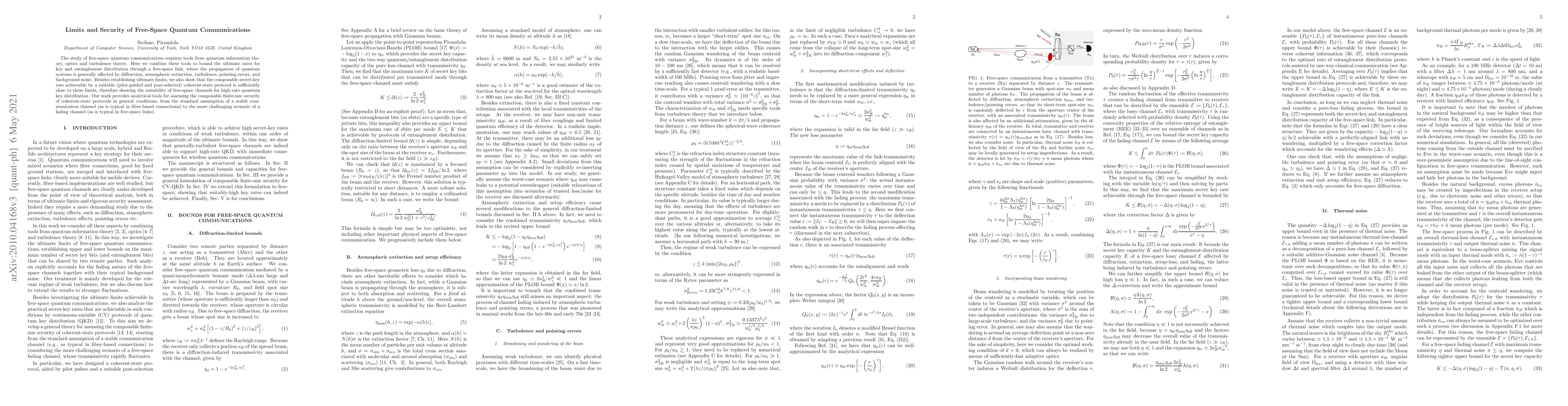 The study of free-space quantum communications requires tools from quantum information theory, optics and turbulence theory. Here we combine these tools to bound the ultimate rates for key and entanglement distribution through a free-space link, where the propagation of quantum systems is generally affected by diffraction, atmospheric extinction, turbulence, pointing errors, and background noise. Besides establishing ultimate limits, we also show that the composable secret-key rate achievable by a suitable (pilot-guided and post-selected) coherent-state protocol is sufficiently close to these limits, therefore showing the suitability of free-space channels for high-rate quantum key distribution. Our work provides analytical tools for assessing the composable finite-size security of coherent-state protocols in general conditions, from the standard assumption of a stable communication channel (as is typical in fiber-based connections) to the more challenging scenario of a fading channel (as is typical in free-space links).