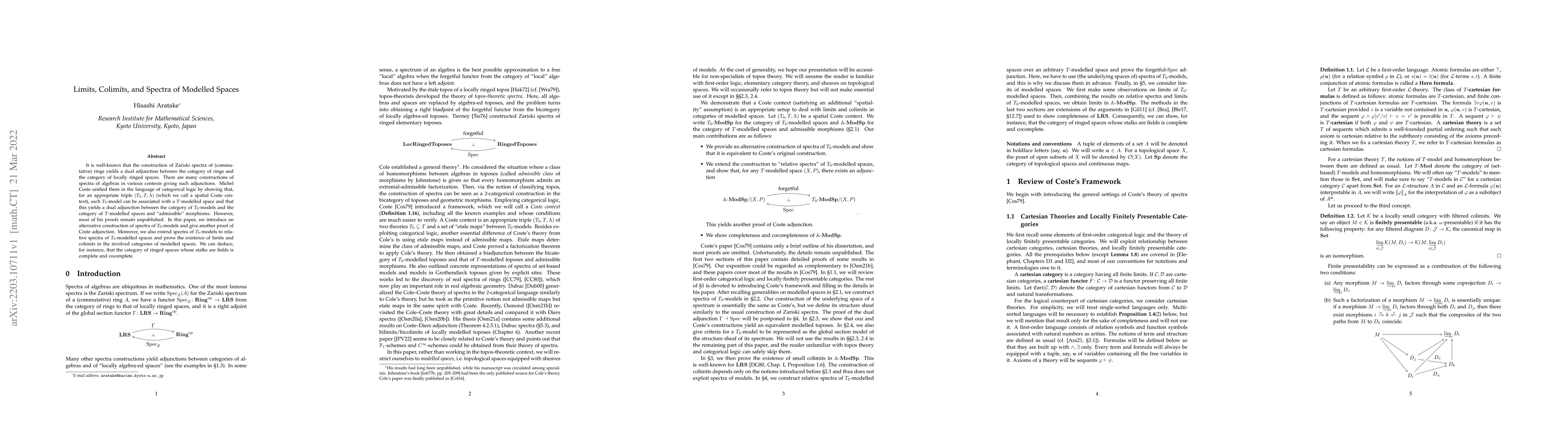 It is well-known that the construction of Zariski spectra of (commutative) rings yields a dual adjunction between the category of rings and the category of locally ringed spaces. There are many constructions of spectra of algebras in various contexts giving such adjunctions. Michel Coste unified them in the language of categorical logic by showing that, for an appropriate triple $ (T_0,T,\Lambda) $ (which we call a spatial Coste context), each $ T_0 $-model can be associated with a $ T $-modelled space and that this yields a dual adjunction between the category of $ T_0 $-models and the category of $ T $-modelled spaces and "admissible" morphisms. However, most of his proofs remain unpublished. In this paper, we introduce an alternative construction of spectra of $ T_0 $-models and give another proof of Coste adjunction. Moreover, we also extend spectra of $ T_0 $-models to relative spectra of $ T_0 $-modelled spaces and prove the existence of limits and colimits in the involved categories of modelled spaces. We can deduce, for instance, that the category of ringed spaces whose stalks are fields is complete and cocomplete.