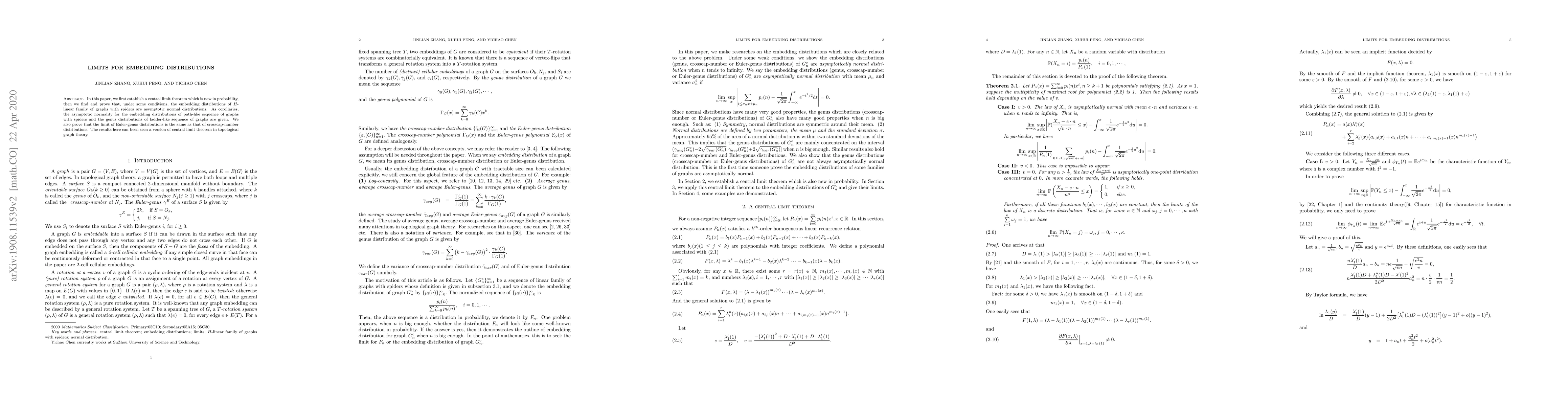 In this paper, we find and prove that, under some conditions, the embedding distributions of $H$-linear graph families with spiders are asymptotic normal distributions. It can been seen a version of central limit theorem in topological graph theory. We also prove that the limits of Euler-genus distributions is the same as limits of crosscap-number distributions. In addition, we show that the Euler-genus distributions (or crosscap-number distributions) of the cacti and necklaces are asymptotically normal distributions. In the end, some concrete examples are indicated.