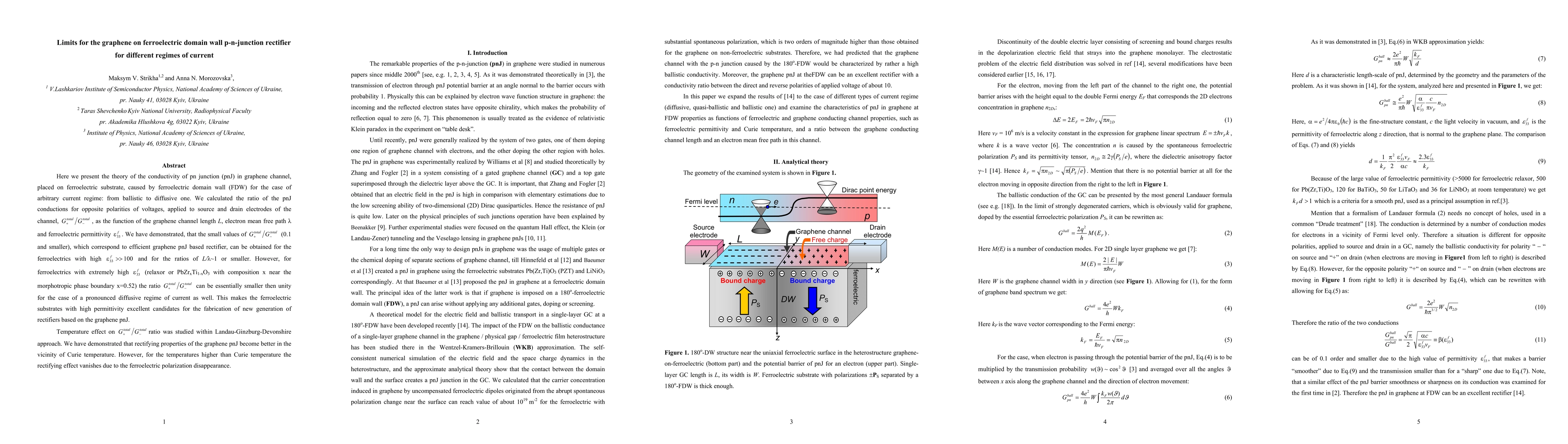 Here we present the theory of the conductivity of pn junction (pnJ) in graphene channel, placed on ferroelectric substrate, caused by ferroelectric domain wall (FDW) for the case of arbitrary current regime: from ballistic to diffusive one. We calculated the ratio of the pnJ conductions for opposite polarities of voltages, applied to source and drain electrodes of the channel,G+/G- as the function of the graphene channel length L, electron mean free path {\lambda} and ferroelectric substrate permittivity. We have demonstrated, that the small values of G+/G-(0.1 and smaller), which correspond to efficient graphene pnJ based rectifier, can be obtained for the ferroelectrics with high and for the ratios of L/{\lambda}~1 or smaller. However, for ferroelectrics with extremely high permittivity(relaxor or PbZrxTi1-xO3 with composition x near the morphotropic phase boundary x=0.52) the ratio G+/G- can be essentially smaller then unity for the case of a pronounced diffusive regime of current as well. This makes the ferroelectric substrates with high permittivity excellent candidates for the fabrication of new generation of rectifiers based on the graphene pnJ. Temperature effect on ratio was studied within Landau-Ginzburg-Devonshire approach. We have demonstrated that rectifying properties of the graphene pnJ become better in the vicinity of Curie temperature. However, for the temperatures higher than Curie temperature the rectifying effect vanishes due to the ferroelectric polarization disappearance.