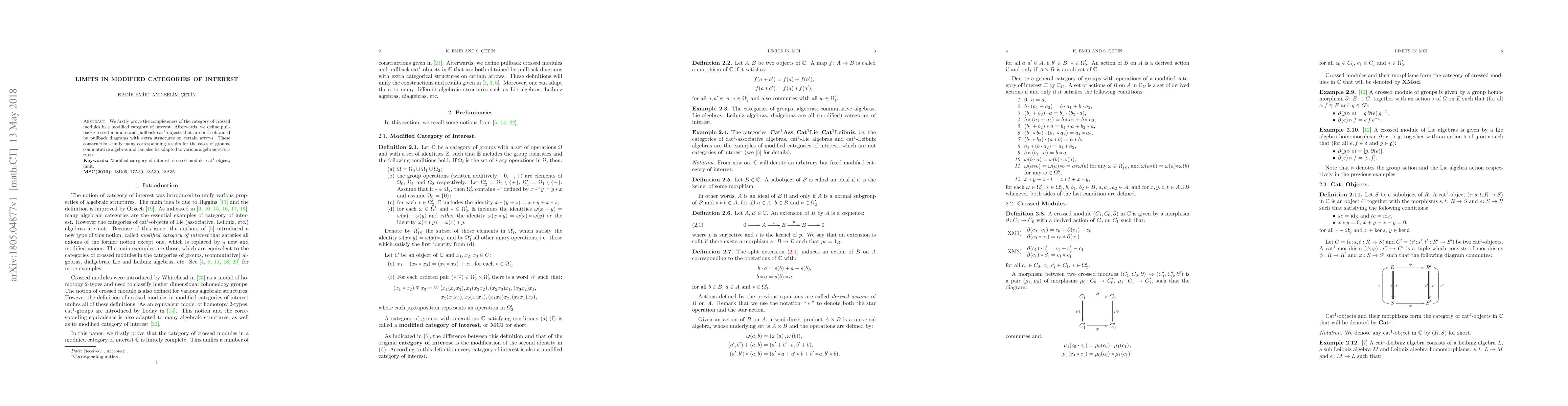 We firstly prove the completeness of the category of crossed modules in a modified category of interest. Afterwards, we define pullback crossed modules and pullback cat$^1$-objects that are both obtained by pullback diagrams with extra structures on certain arrows. These constructions unify many corresponding results for the cases of groups, commutative algebras and can also be adapted to various algebraic structures.