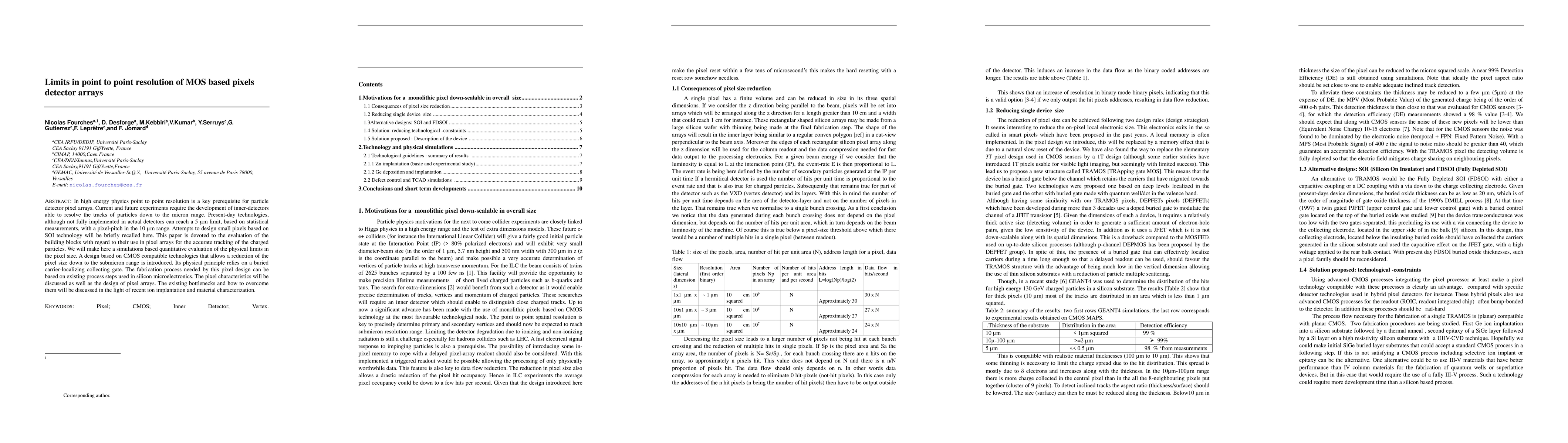 Researchers investigate ways to improve point-to-point resolution in particle detector arrays, aiming to reduce pixel size from 10 micrometers to sub-micron ranges using CMOS-compatible technologies.