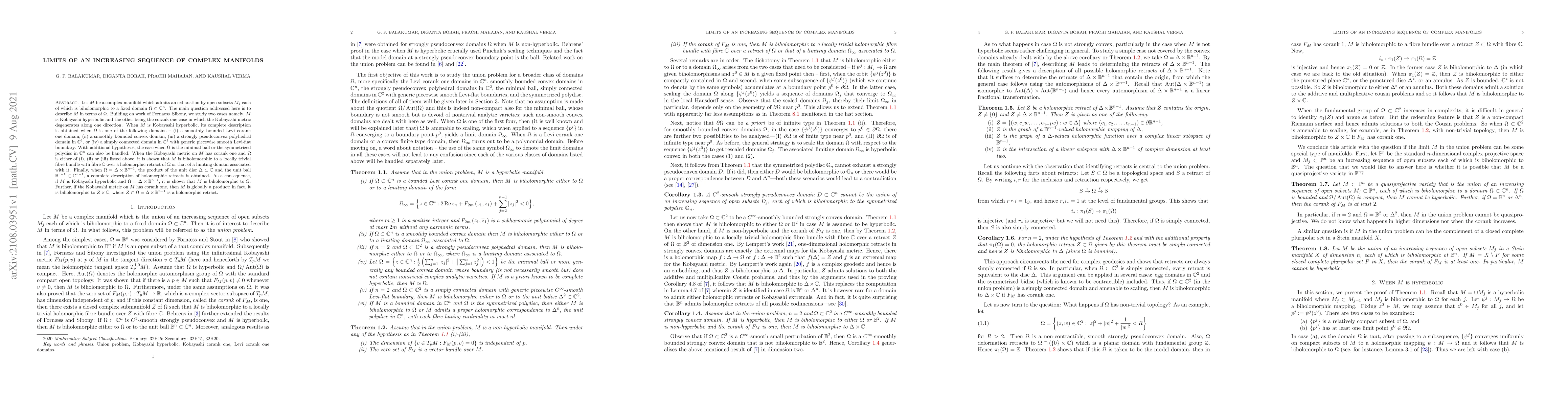 Let $M$ be a complex manifold which admits an exhaustion by open subsets $M_j$ each of which is biholomorphic to a fixed domain $\Omega \subset \mathbb C^n$. The main question addressed here is to describe $M$ in terms of $\Omega$. Building on work of Fornaess--Sibony, we study two cases namely, $M$ is Kobayashi hyperbolic and the other being the corank one case in which the Kobayashi metric degenerates along one direction. When $M$ is Kobayashi hyperbolic, its complete description is obtained when $\Omega$ is one of the following domains -- (i) a smoothly bounded Levi corank one domain, (ii) a smoothly bounded convex domain, (iii) a strongly pseudoconvex polyhedral domain in $\mathbb C^2$, or (iv) a simply connected domain in $\mathbb C^2$ with generic piecewise smooth Levi-flat boundary. With additional hypotheses, the case when $\Omega$ is the minimal ball or the symmetrized polydisc in $\mathbb C^n$ can also be handled. When the Kobayashi metric on $M$ has corank one and $\Omega$ is either of (i), (ii) or (iii) listed above, it is shown that $M$ is biholomorphic to a locally trivial fibre bundle with fibre $\mathbb C$ over a holomorphic retract of $\Omega$ or that of a limiting domain associated with it. Finally, when $\Omega = \Delta \times \mathbb B^{n-1}$, the product of the unit disc $\Delta \subset \mathbb C$ and the unit ball $\mathbb B^{n-1} \subset \mathbb C^{n-1}$, a complete description of holomorphic retracts is obtained. As a consequence, if $M$ is Kobayashi hyperbolic and $\Omega = \Delta \times \mathbb B^{n-1}$, it is shown that $M$ is biholomorphic to $\Omega$. Further, if the Kobayashi metric on $M$ has corank one, then $M$ is globally a product; in fact, it is biholomorphic to $Z \times \mathbb C$, where $Z \subset \Omega = \Delta \times \mathbb B^{n-1}$ is a holomorphic retract.