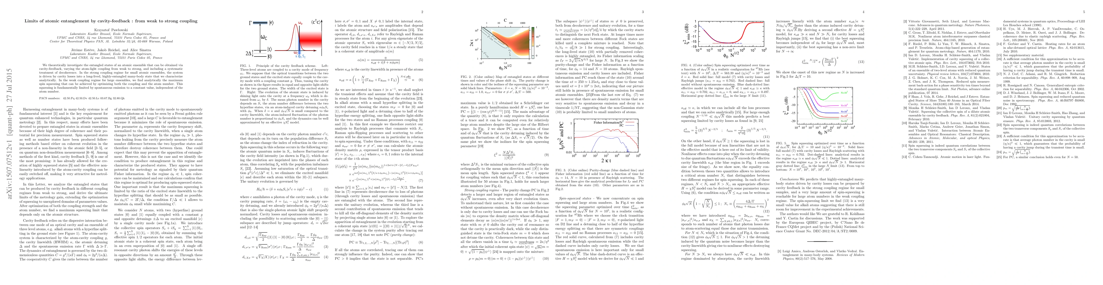 We theoretically investigate the entangled states of an atomic ensemble that can be obtained via cavity-feedback, varying the atom-light coupling from weak to strong, and including a systematic treatment of decoherence. In the strong coupling regime for small atomic ensembles, the system is driven by cavity losses into a long-lived, highly-entangled many-body state that we characterize analytically. In the weak coupling regime for large ensembles, we find analytically the maximum spin squeezing that can be achieved by optimizing both the coupling and the atom number. This squeezing is fundamentally limited by spontaneous emission to a constant value, independent of the atom number. Harnessing entanglement in many-body systems is of fundamental interest [1] and is the key requirement for quantum enhanced technologies, in particular quantum metrology [2]. In this respect, many efforts have been devoted to prepare entangled states in atomic ensembles because of their high degree of coherence and their potential for precision measurement. Spin squeezed states as well as number states have been produced following methods based either on coherent evolution in the presence of a non-linearity in the atomic field [3--5], or on quantum non-demolition measurement [6--8]. Among methods of the first kind, cavity feedback [5, 9] is one of the most promising: it has already allowed for the creation of highly squeezed states [5] and the effective non-linearity introduced by the atom-cavity coupling can be easily switched off, making it very attractive for metrol-ogy applications. In this Letter, we analyze the entangled states that can be produced by cavity feedback in different coupling regimes from weak to strong, and derive the ultimate limits of the metrology gain, extending the optimization of squeezing to unexplored domains of parameters values. After optimization of both the coupling strength and the atom number, we find a maximum squeezing limit that depends only on the atomic structure.