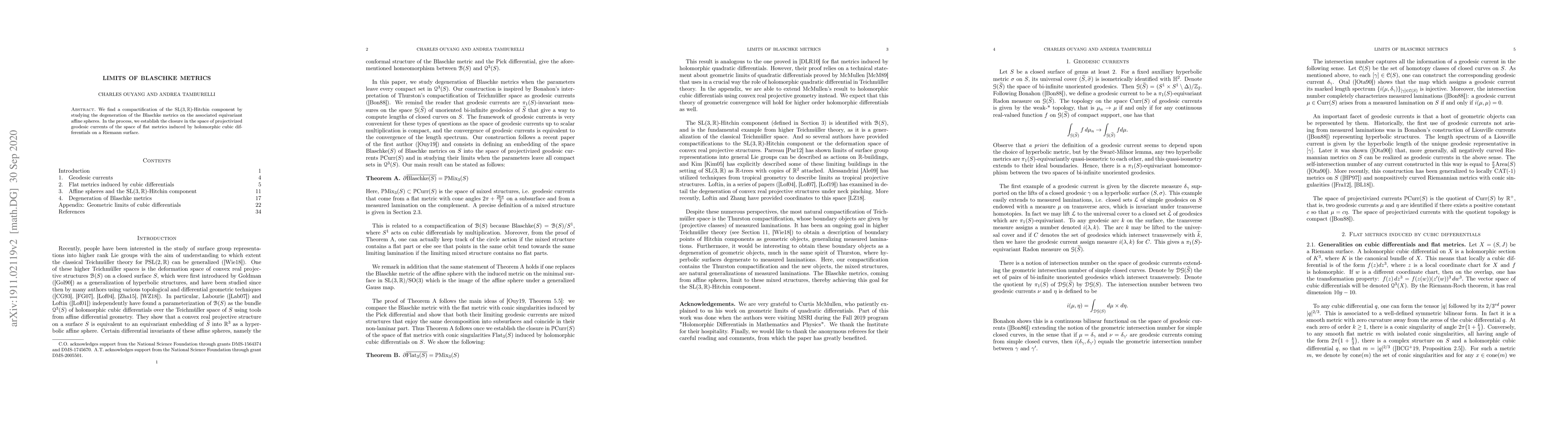 This paper compactifies the $\mathrm{SL}(3,\mathbb{R})$-Hitchin component by examining the degeneration of Blaschke metrics on equivariant affine spheres, and it demonstrates the closure of flat metrics from holomorphic cubic differentials in the space of projectivized geodesic currents.