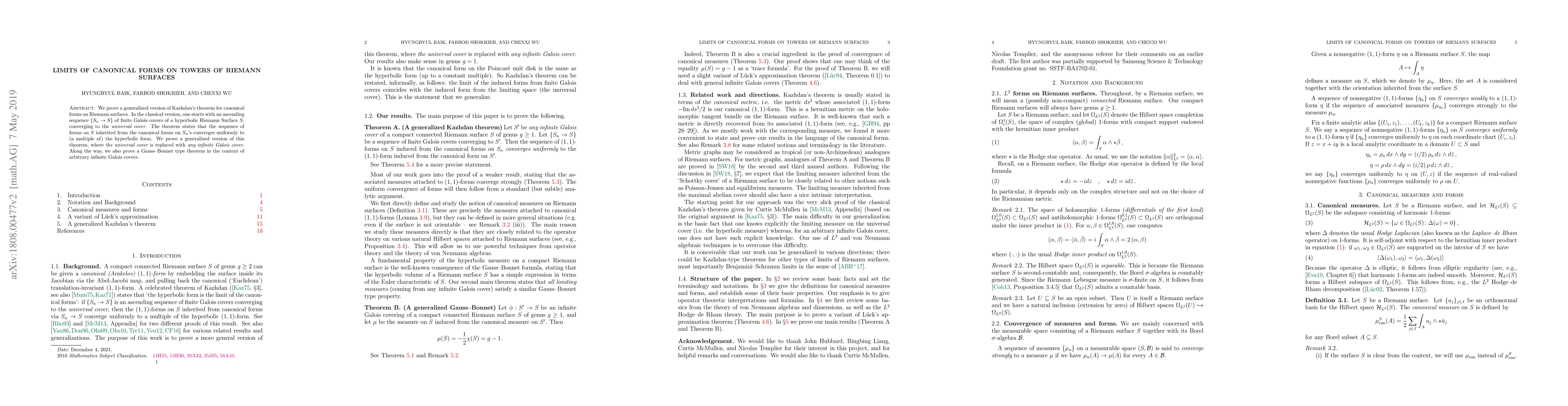 We prove a generalized version of Kazhdan's theorem for canonical forms on Riemann surfaces. In the classical version, one starts with an ascending sequence $\{S_n \rightarrow S\}$ of finite Galois covers of a hyperbolic Riemann Surface $S$, converging to the universal cover. The theorem states that the sequence of forms on $S$ inherited from the canonical forms on $S_n$'s converges uniformly to (a multiple of) the hyperbolic form. We prove a generalized version of this theorem, where the universal cover is replaced with any infinite Galois cover. Along the way, we also prove a Gauss--Bonnet type theorem in the context of arbitrary infinite Galois covers.