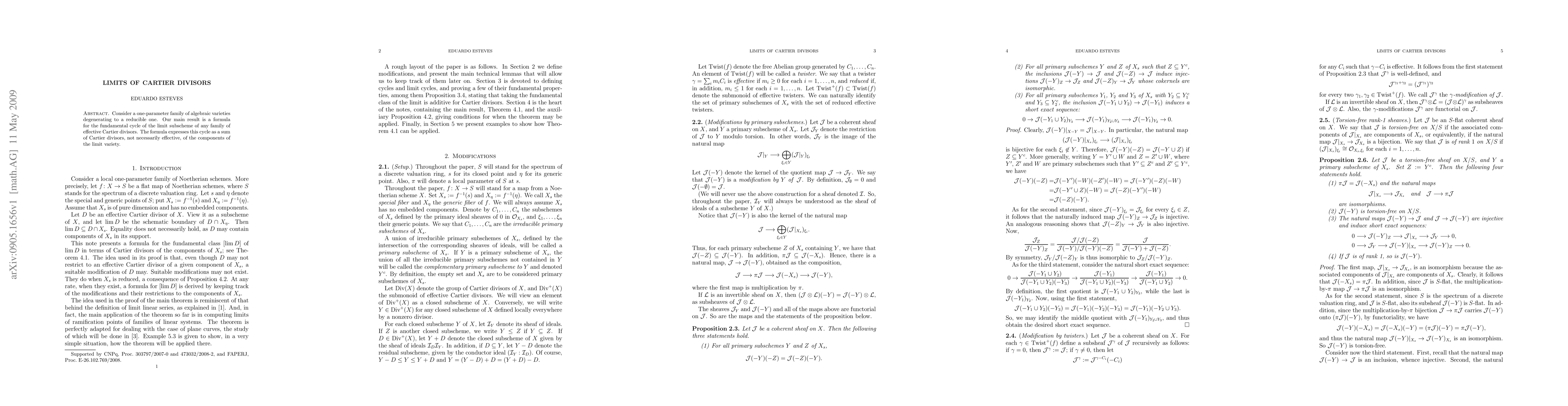 Summary: The paper derives a formula for the fundamental cycle of the limit subscheme of effective Cartier divisors in a one-parameter family of algebraic varieties that degenerates to a reducible one, expressing the cycle as a sum of Cartier divisors on the components of the limit variety.