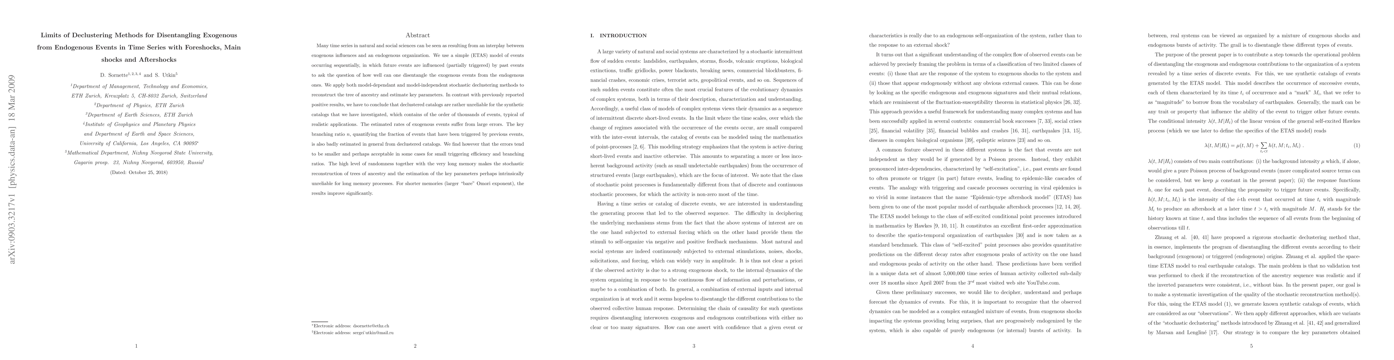 Many time series in natural and social sciences can be seen as resulting from an interplay between exogenous influences and an endogenous organization. We use a simple (ETAS) model of events occurring sequentially, in which future events are influenced (partially triggered) by past events to ask the question of how well can one disentangle the exogenous events from the endogenous ones. We apply both model-dependant and model-independent stochastic declustering methods to reconstruct the tree of ancestry and estimate key parameters. In contrast with previously reported positive results, we have to conclude that declustered catalogs are rather unreliable for the synthetic catalogs that we have investigated, which contains of the order of thousands of events, typical of realistic applications. The estimated rates of exogenous events suffer from large errors. The key branching ratio $n$, quantifying the fraction of events that have been triggered by previous events, is also badly estimated in general from declustered catalogs. We find however that the errors tend to be smaller and perhaps acceptable in some cases for small triggering efficiency and branching ratios. The high level of randomness together with the very long memory makes the stochastic reconstruction of trees of ancestry and the estimation of the key parameters perhaps intrinsically unreliable for long memory processes. For shorter memories (larger "bare" Omori exponent), the results improve significantly.