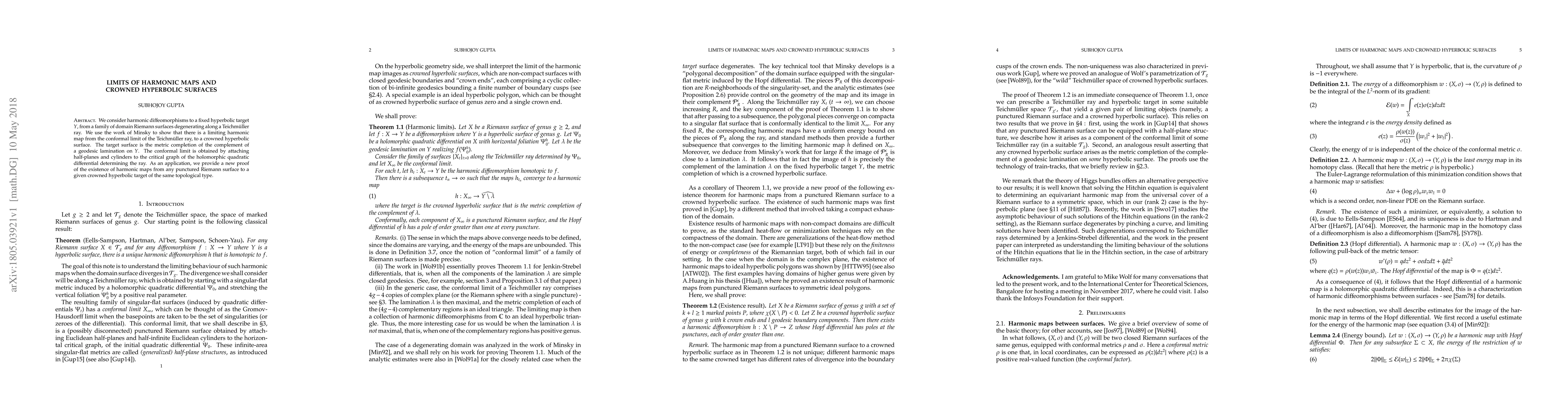 This paper explores the limits of harmonic diffeomorphisms from degenerating families of Riemann surfaces to a fixed hyperbolic target, demonstrating that a limiting harmonic map exists to a crowned hyperbolic surface. The study leverages Minsky's work to establish this result and provides a new proof for the existence of harmonic maps from punctured Riemann surfaces to crowned hyperbolic targets.