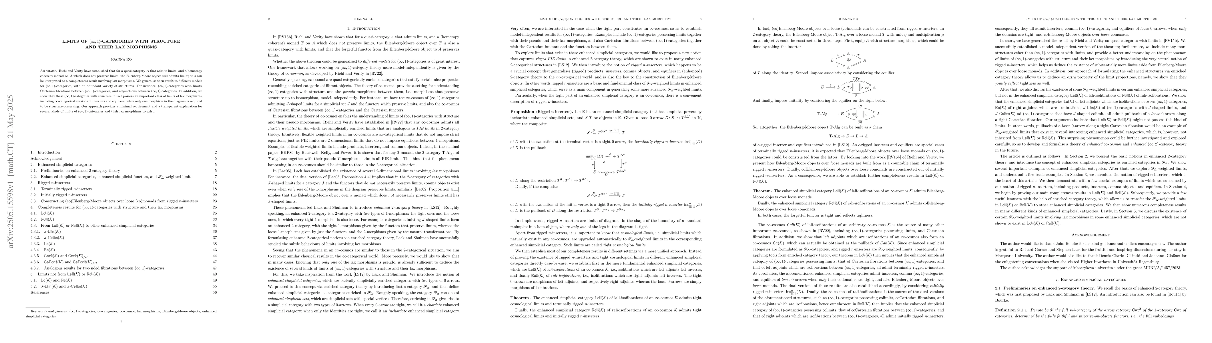 This paper generalizes a result on limits of $(rac{1}{ ext{α}}, 1)$-categories with structure and their lax morphisms, establishing the existence of certain limits, including those for inserters and equifiers, in various models.