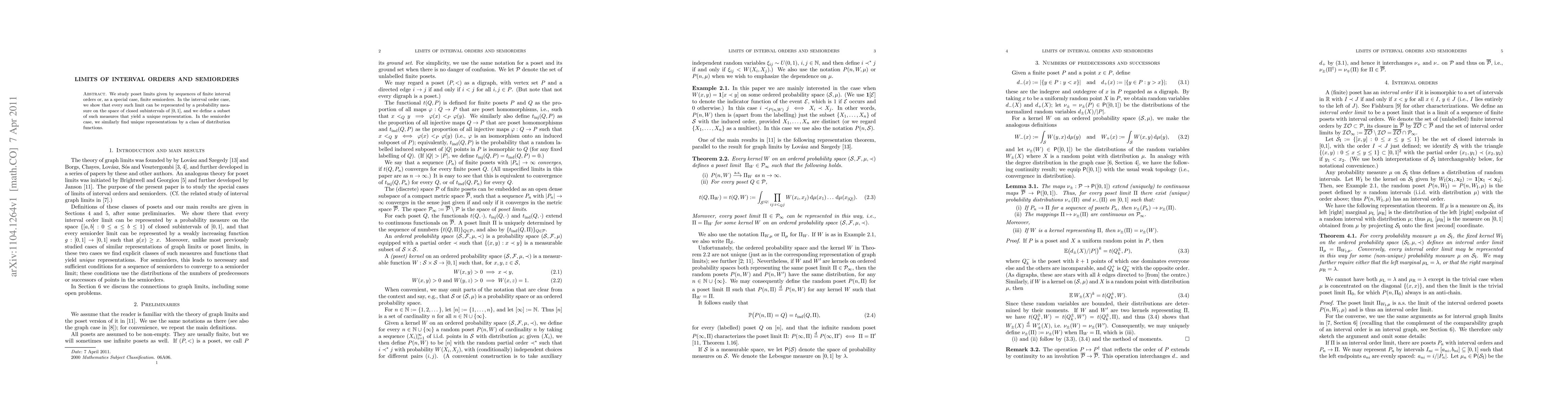 We study poset limits given by sequences of finite interval orders or, as a special case, finite semiorders. In the interval order case, we show that every such limit can be represented by a probability measure on the space of closed subintervals of [0,1], and we define a subset of such measures that yield a unique representation. In the semiorder case, we similarly find unique representations by a class of distribution functions.