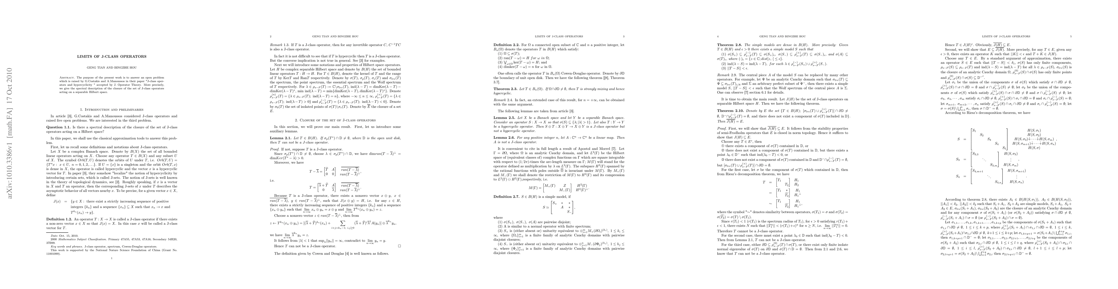 The purpose of the present work is to answer an open problem which is raised by G.Costakis and A.Manoussos in their paper "J-class operators and hypercyclicity " accepted by J. Operator Theory. More precisely, we give the spectral description of the closure of the set of J-class operators acting on a separable Hilbert space.