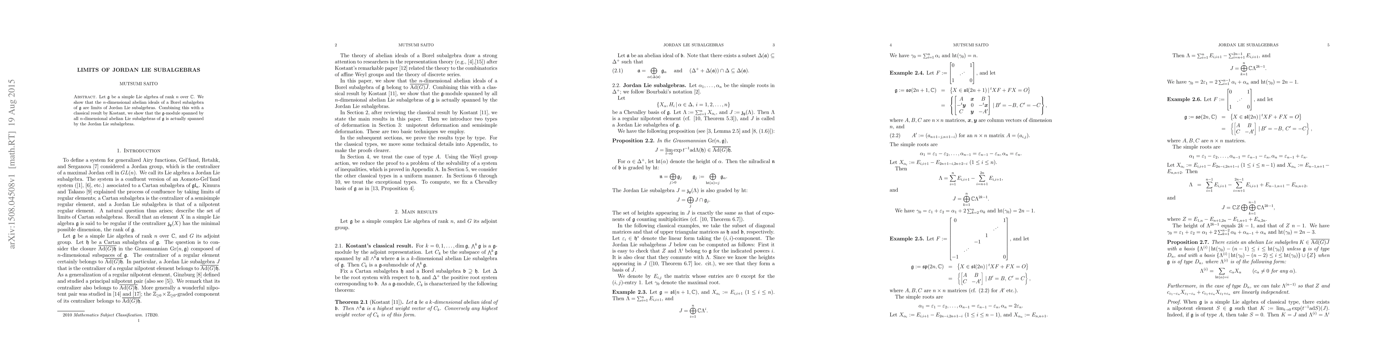 This paper demonstrates that n-dimensional abelian ideals in Borel subalgebras of a simple Lie algebra g are limits of Jordan Lie subalgebras. It further proves that the g-module generated by all such n-dimensional abelian ideals is spanned by Jordan Lie subalgebras, building on a classical result by Kostant.