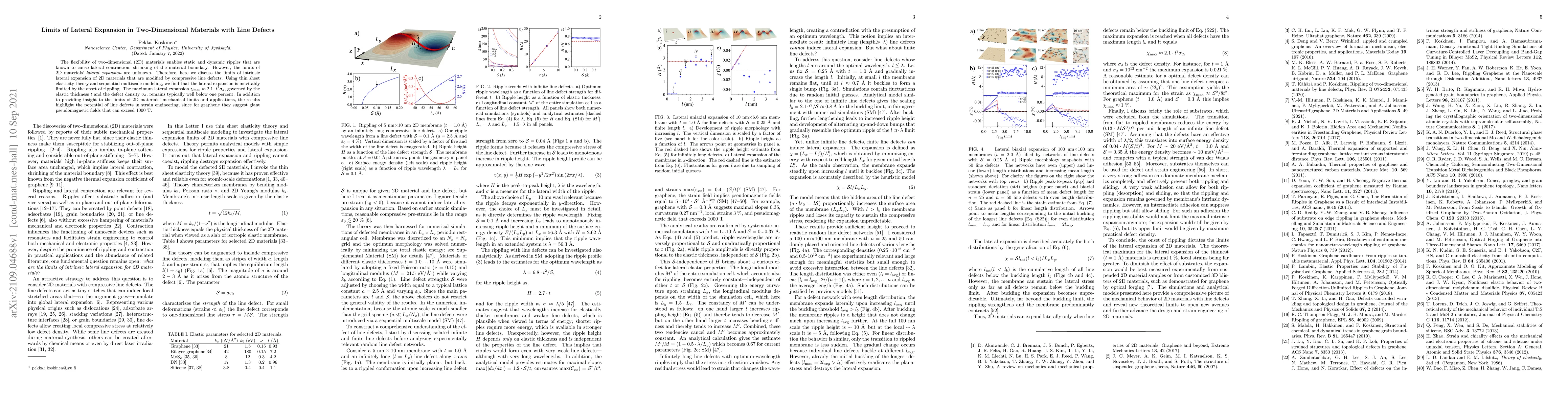 This paper explores the intrinsic limits of lateral expansion in two-dimensional materials modified by compressive line defects. It finds that the maximum expansion is constrained by rippling, with $\chi_{max}\approx 2.1\cdot t^2\sigma_d$ governed by material thickness and defect density, typically below 1%. The study also highlights the potential for strain engineering using line defects.