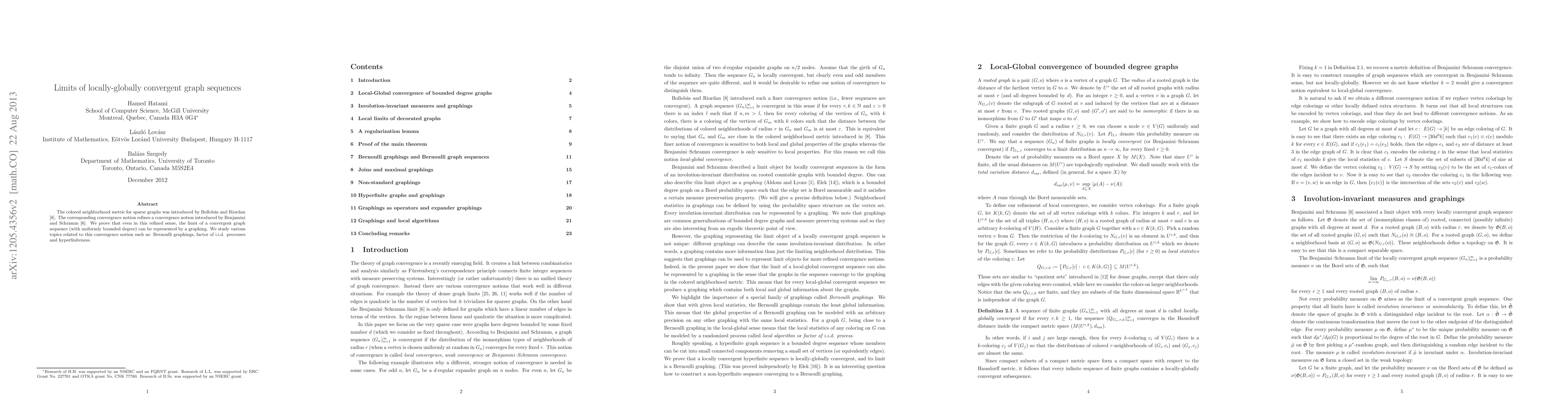 This paper explores the limits of locally and globally convergent graph sequences using the refined colored neighborhood metric. It demonstrates that the limit of a convergent graph sequence can be represented by a graphing and investigates related topics like Bernoulli graphings, factor of i.i.d. processes, and hyperfiniteness.