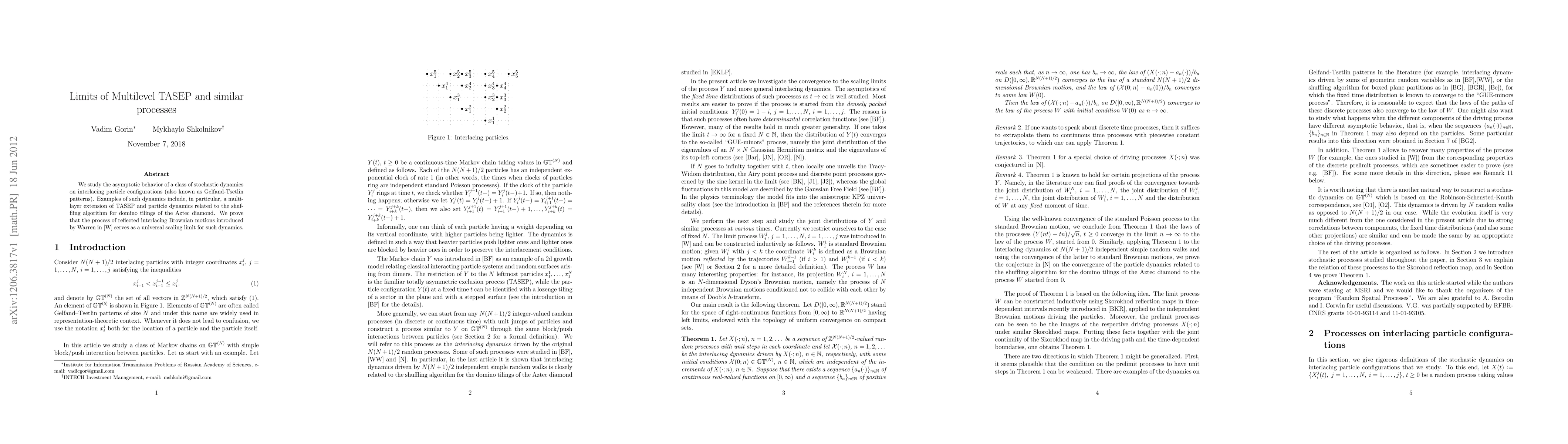 We study the asymptotic behavior of a class of stochastic dynamics on interlacing particle configurations (also known as Gelfand-Tsetlin patterns). Examples of such dynamics include, in particular, a multi-layer extension of TASEP and particle dynamics related to the shuffling algorithm for domino tilings of the Aztec diamond. We prove that the process of reflected interlacing Brownian motions introduced by Warren in \cite{W} serves as a universal scaling limit for such dynamics.