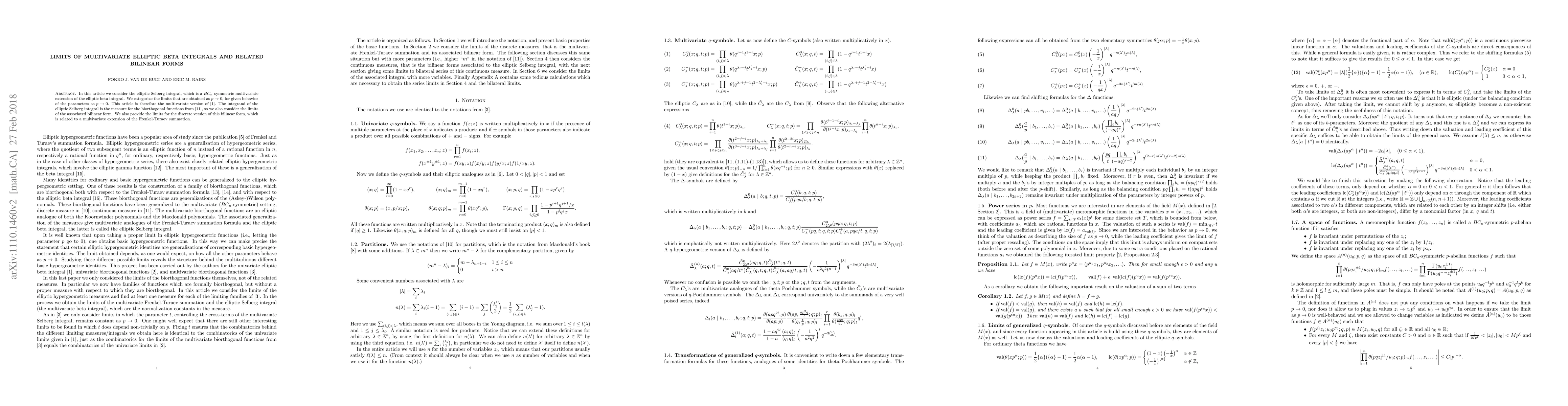 This paper explores the limits of multivariate elliptic beta integrals and related bilinear forms, focusing on the elliptic Selberg integral as a BC_n symmetric extension. It categorizes limits as parameters approach zero, extending findings from a prior study on basic hypergeometric functions. Additionally, it examines the limits of associated bilinear forms and their discrete versions, linked to a multivariate Frenkel-Turaev summation.