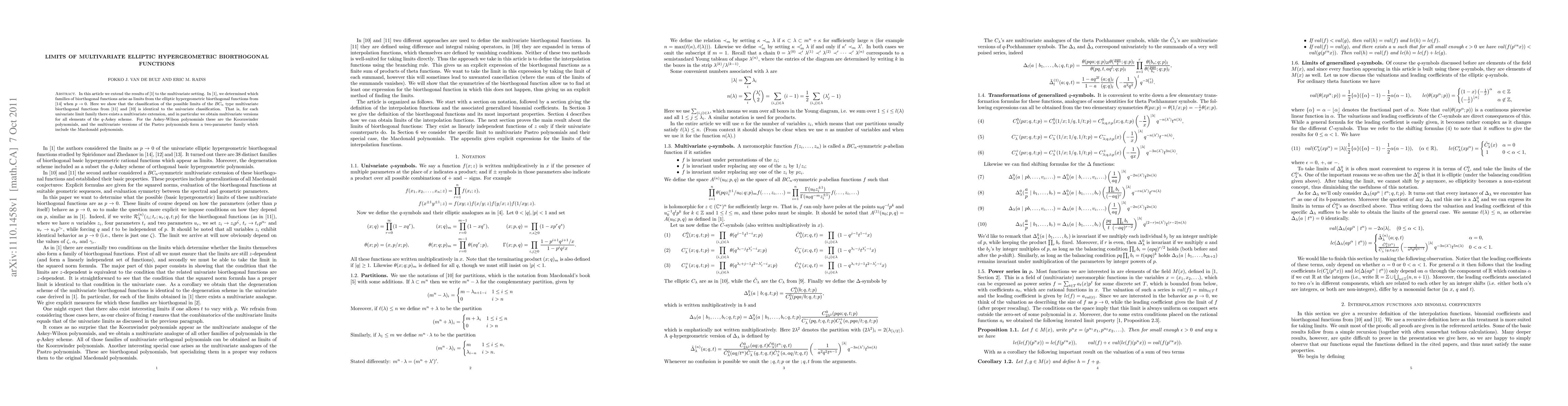 This paper extends the classification of limits of univariate elliptic hypergeometric biorthogonal functions to the multivariate setting, showing that the multivariate limits of the BC_n type functions match the univariate classification. It provides multivariate versions of all elements of the q-Askey scheme, including Koornwinder polynomials for Askey-Wilson polynomials and a two-parameter family for Pastro polynomials encompassing Macdonald polynomials.