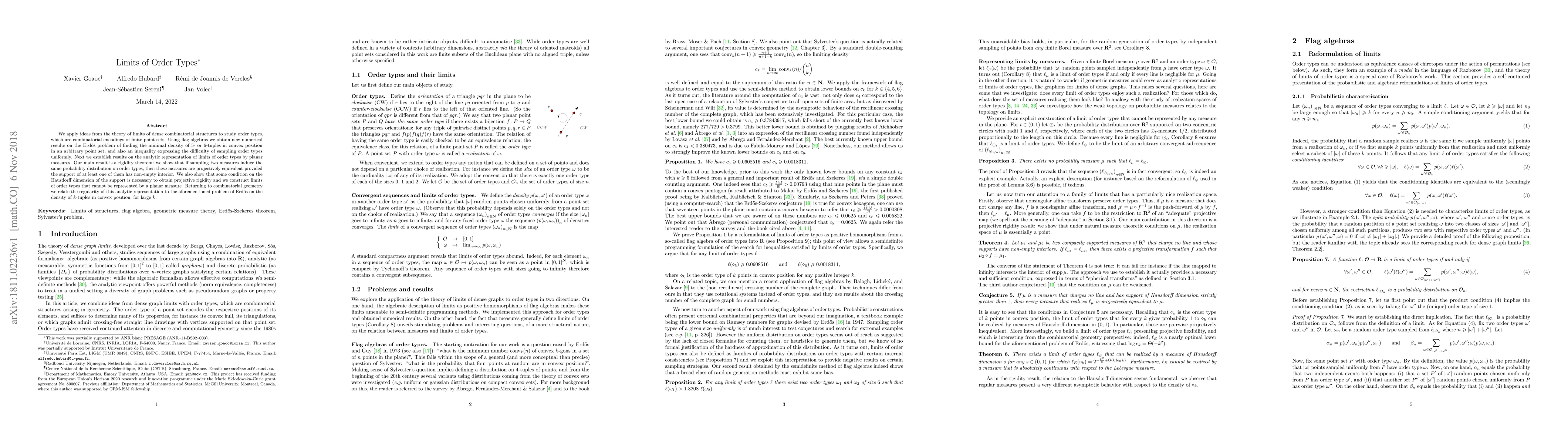 We apply ideas from the theory of limits of dense combinatorial structures to study order types, which are combinatorial encodings of finite point sets. Using flag algebras we obtain new numerical results on the Erd\H{o}s problem of finding the minimal density of 5-or 6-tuples in convex position in an arbitrary point set, and also an inequality expressing the difficulty of sampling order types uniformly. Next we establish results on the analytic representation of limits of order types by planar measures. Our main result is a rigidity theorem: we show that if sampling two measures induce the same probability distribution on order types, then these measures are projectively equivalent provided the support of at least one of them has non-empty interior. We also show that some condition on the Hausdorff dimension of the support is necessary to obtain projective rigidity and we construct limits of order types that cannot be represented by a planar measure. Returning to combinatorial geometry we relate the regularity of this analytic representation to the aforementioned problem of Erd\H{o}s on the density of k-tuples in convex position, for large k.