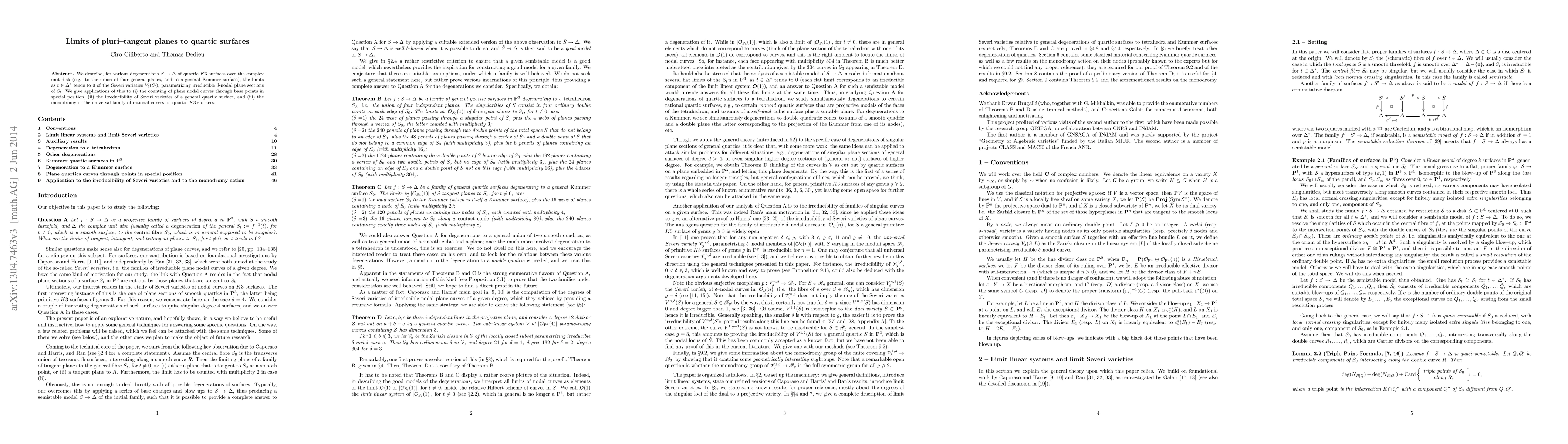 This research paper explores the limits of pluri-tangent planes to quartic surfaces as a degeneration tends to 0, with applications in counting plane nodal curves, irreducibility of Severi varieties, and monodromy of rational curves.