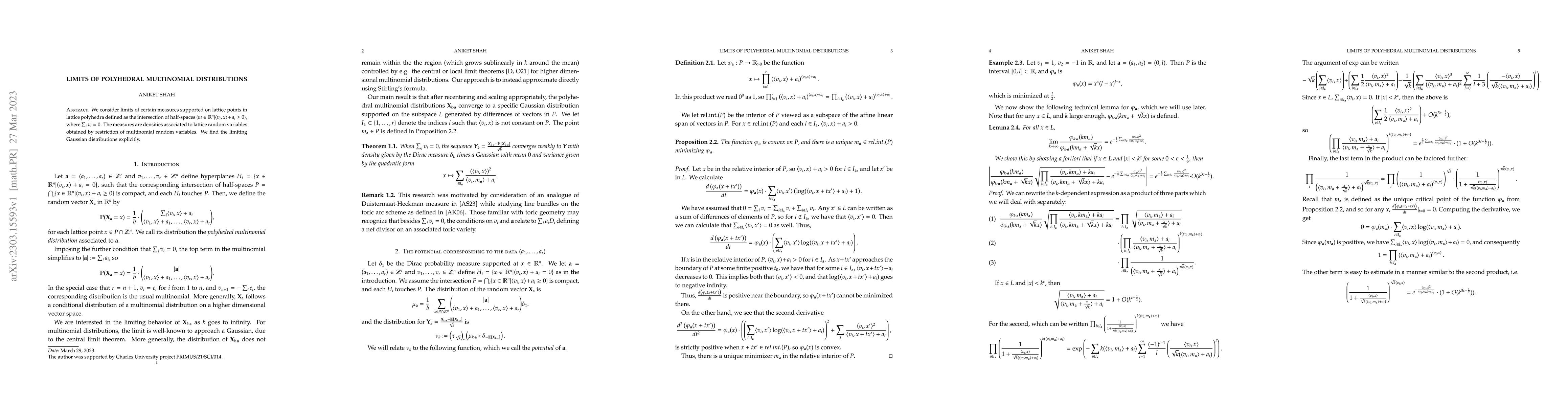 We consider limits of certain measures supported on lattice points in lattice polyhedra defined as the intersection of half-spaces $\{m\in\mathbb{R}^n|\langle v_i,x\rangle+a_i \geq 0\}$, where $\sum_i v_i = 0$. The measures are densities associated to lattice random variables obtained by restriction of multinomial random variables. We find the limiting Gaussian distributions explicitly.