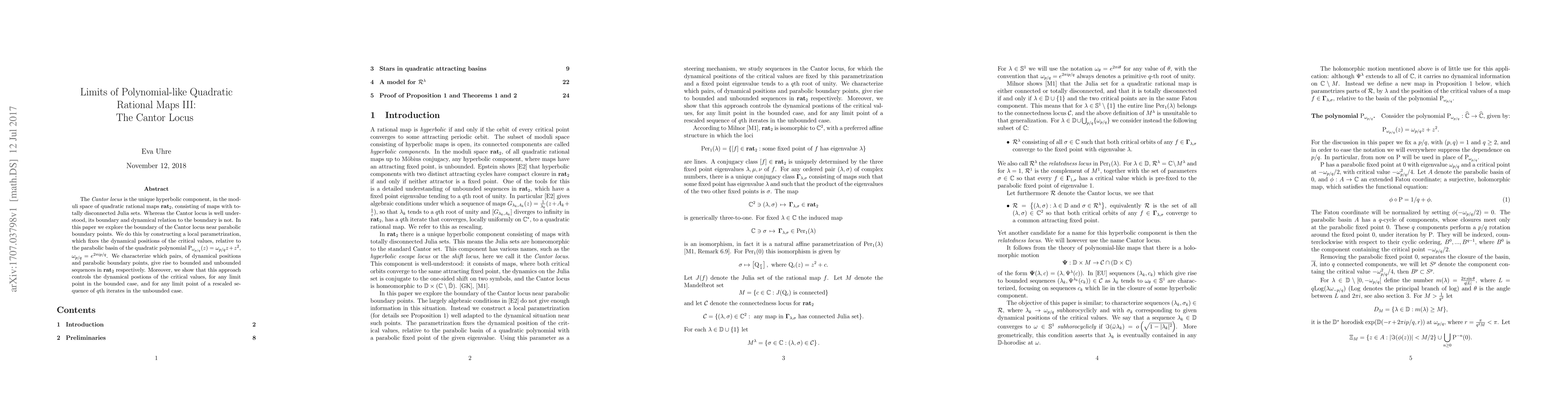 The Cantor locus is the unique hyperbolic component, in the moduli space of quadratic rational maps ${\bf rat}_2$, consisting of maps with totally disconnected Julia sets. Whereas the Cantor locus is well understood, its boundary and dynamical relation to the boundary is not. In this paper we explore the boundary of the Cantor locus near parabolic boundary points. We do this by constructing a local parametrization, which fixes the dynamical positions of the critical values, relative to the parabolic basin of the quadratic polynomial $\mathrm{P}_{\omega_{p/q}}(z)=\omega_{p/q} z+z^2$, $\omega_{p/q}=e^{2\pi ip/q}$. We characterize which pairs, of dynamical positions and parabolic boundary points, give rise to bounded and unbounded sequences in ${\bf rat}_2$ respectively. Moreover, we show that this approach controls the dynamical postions of the critical values, for any limit point in the bounded case, and for any limit point of a rescaled sequence of $q$th iterates in the unbounded case.