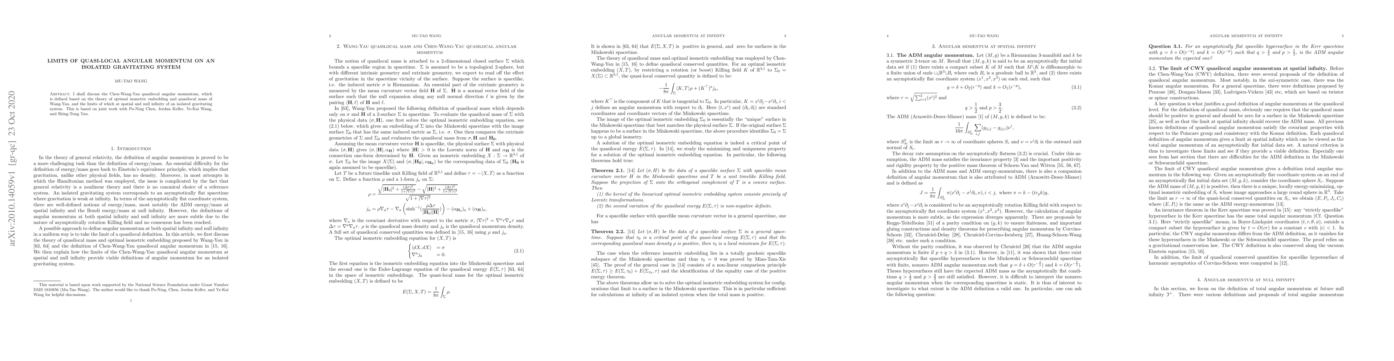 I shall discuss the Chen-Wang-Yau quasilocal angular momentum, which is defined based on the theory of optimal isometric embedding and quasilocal mass of Wang-Yau, and the limits of which at spatial and null infinity of an isolated gravitating system. This is based on joint work with Po-Ning Chen, Jordan Keller, Ye-Kai Wang, and Shing-Tung Yau.