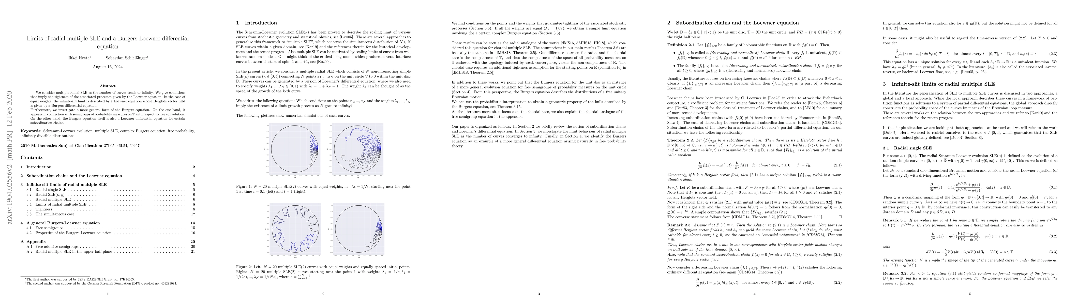 We consider multiple radial SLE as the number of curves tends to infinity. We give conditions that imply the tightness of the associated processes given by the Loewner equation. In the case of equal weights, the infinite-slit limit is described by a Loewner equation whose Herglotz vector field is given by a Burgers differential equation. Furthermore, we investigate a more general form of the Burgers equation. On the one hand, it appears in connection with semigroups of probability measures on the unit circle with respect to free convolution. On the other hand, the Burgers equation itself is also a Loewner differential equation for certain subordination chains.